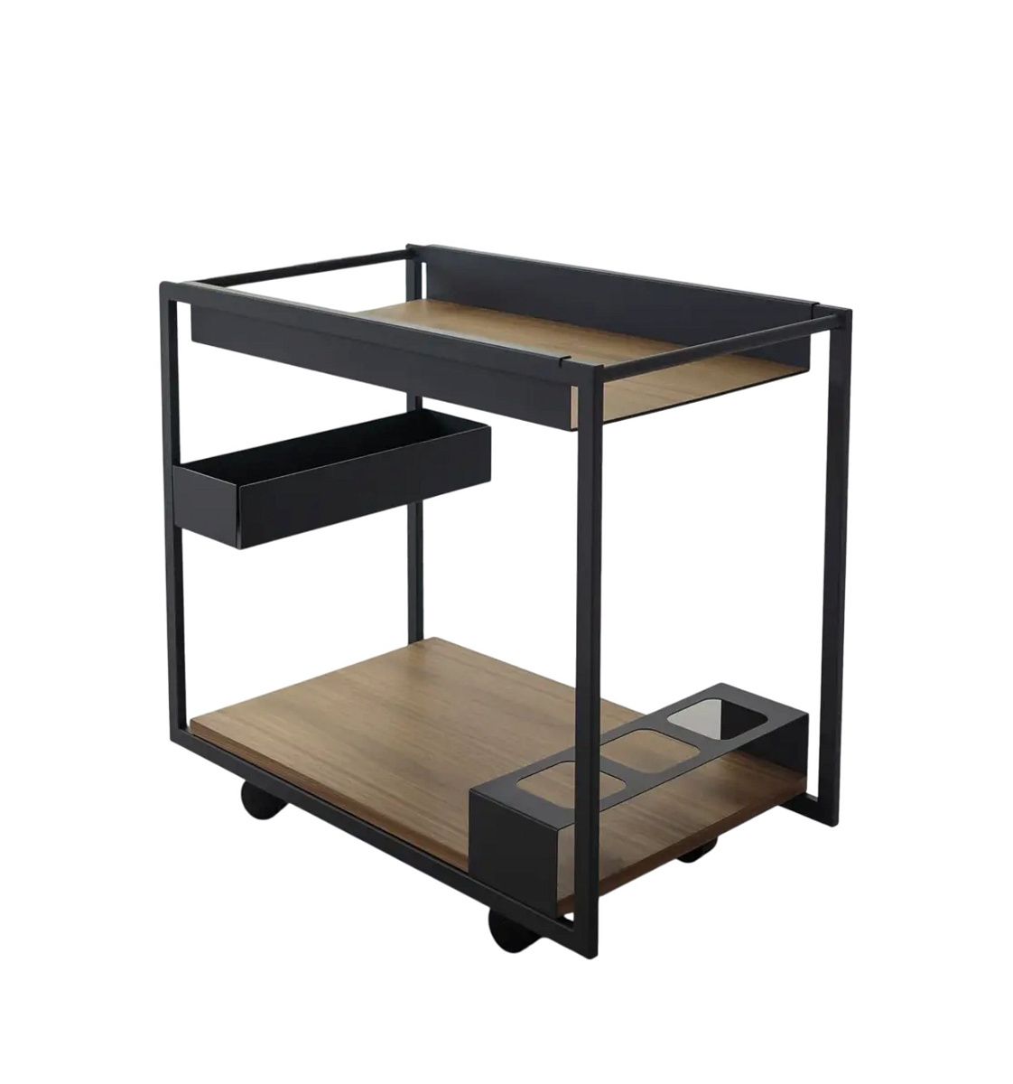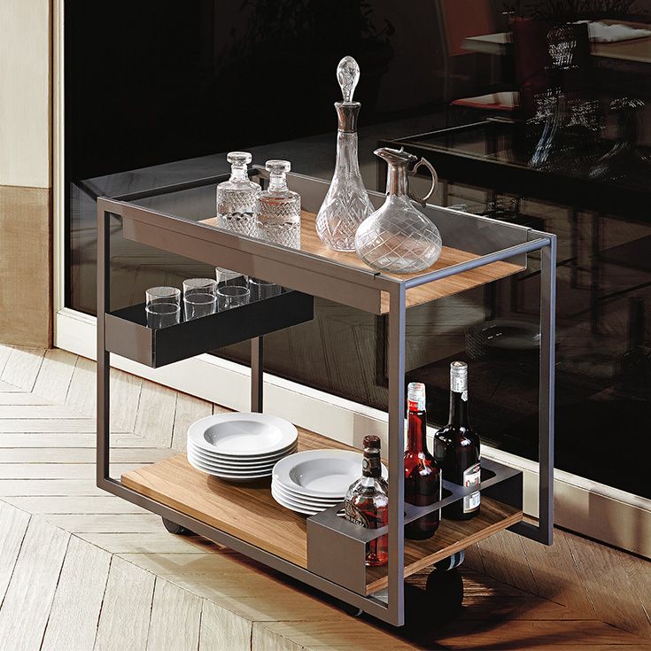 Mojito Wood — это современная тележка для бара с геометрическим и линейным дизайном. Два деревянных подноса поддерживаются элегантной стальной рамой с минималистичным дизайном. Дизайнерская тележка для бара оснащена отделением для бутылок и практичным открытым отделением половинной высоты, оба из которых соответствуют лакированной графитовой отделке стальной конструкции. Эта тележка для бара имеет практичный и скромный размер; это элегантный, но современный аксессуар, который поможет вам приветствовать ваших гостей в современной гостиной .