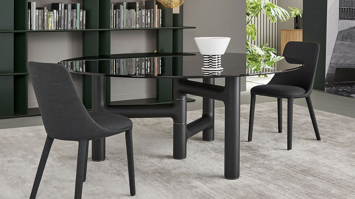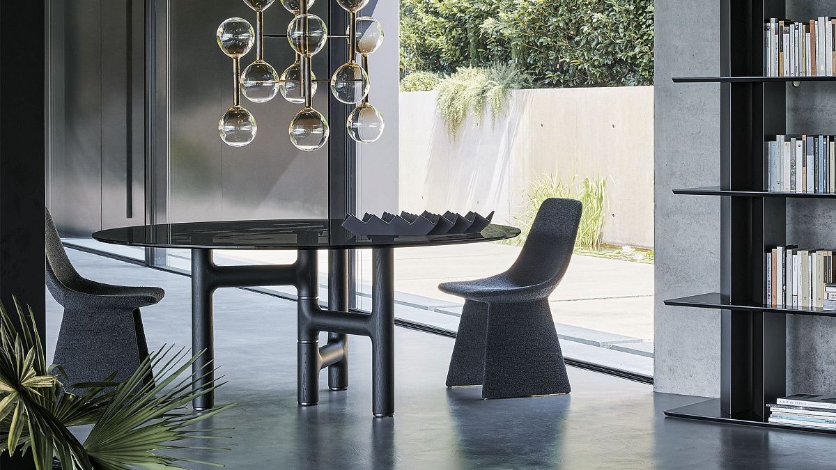 Стол Pivot получил свое название из-за своеобразной формы основания: центральная ножка стола служит осью для трех ножек, расположенных по бокам. В результате получается асимметричная и совершенно оригинальная композиция, придающая интерьеру неповторимую индивидуальность. Ножки изготовлены из массива ясеня угольного или орехового цвета с металлическими вставками, а столешница может быть выполнена из мрамора, дерева, стекла и керамики в двух вариантах формы – круглой и цилиндрической.
