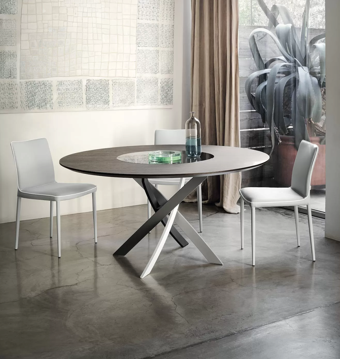 Стол Barone Ring выполнен на раме из лакированной стали различных оттенков. Внешняя верхняя часть (кольцо) и центральная вращающаяся утопленная верхняя часть, из которой состоит верхняя часть, доступны в различных вариантах отделки.