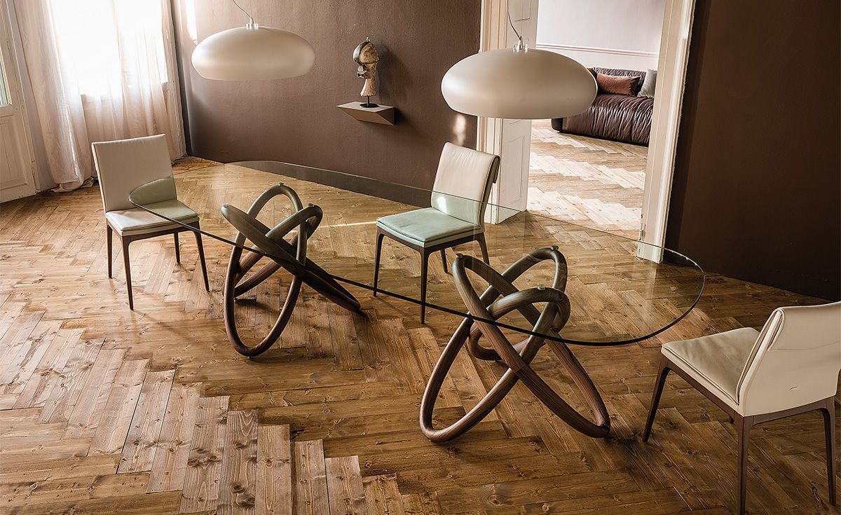 Стеклянный стол Ca Rioca - это изощренный и оригинальный предмет обстановки. Это - современный стол со скульптурной базой, тремя деревянными кольцами и ценной столешницей из стекла, который придаст вашему дому изысканный оттенок. Ca Rioca может быть реализован как прямоугольный стеклянный стол, имеющий фигурную форму, или же как современный круглый стол различных размеров. Этот стол украшает не только впечатляющий дизайн основания из массивного дерева, в нем, прежде всего, привлекает качество изготовления и материалов, а также внимание к деталям, что отличает итальянское производство.