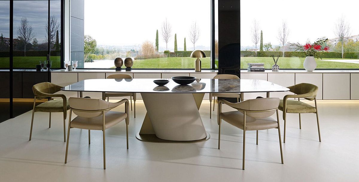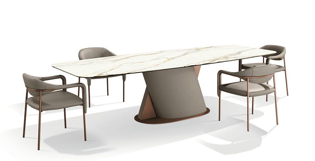 Современный обеденный стол со скрещенным основанием, обтянутым кожей, отличается современным дизайном и очаровательной элегантностью. Круглые части стола искусно обтянуты кожей, внутренние профили изготовлены из окрашенного металла. Этот обеденный стол предлагает широкие возможности для персонализации: от материалов столешницы — керамика или мрамор — и выбора кожи различных цветов и текстур, до металлической отделки. Прямоугольная столешница также доступна в разных размерах для идеальной адаптации к жилому пространству и стилю покупателя. Кроме того, в нашей коллекции предусмотрен консольный столик такой же формы, для стилизации и обеспечения функциональности в прихожих, коридорах и других помещениях.