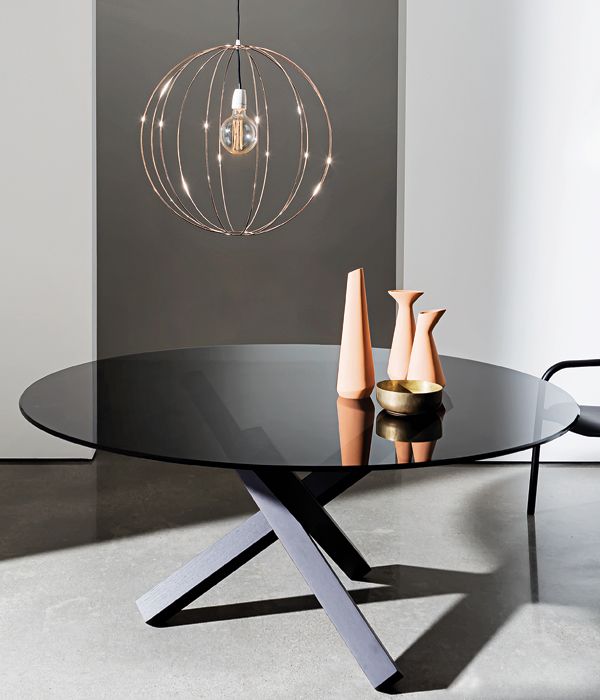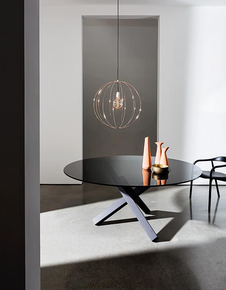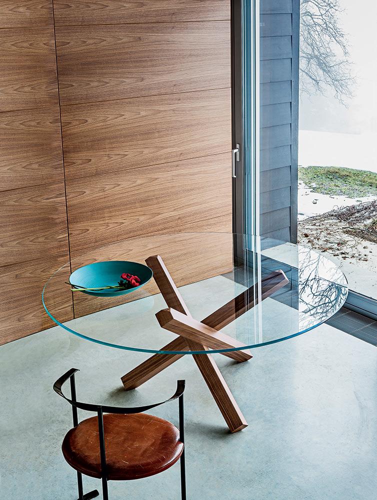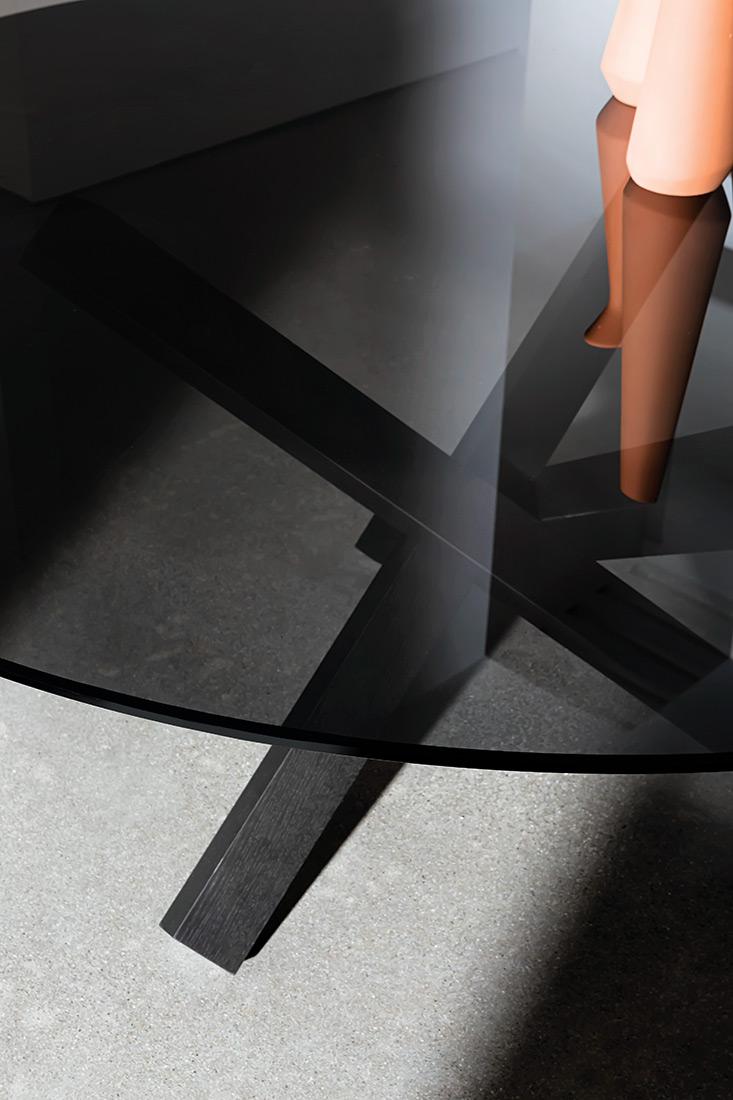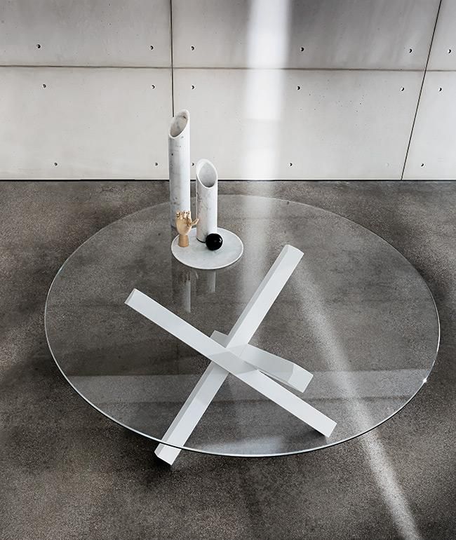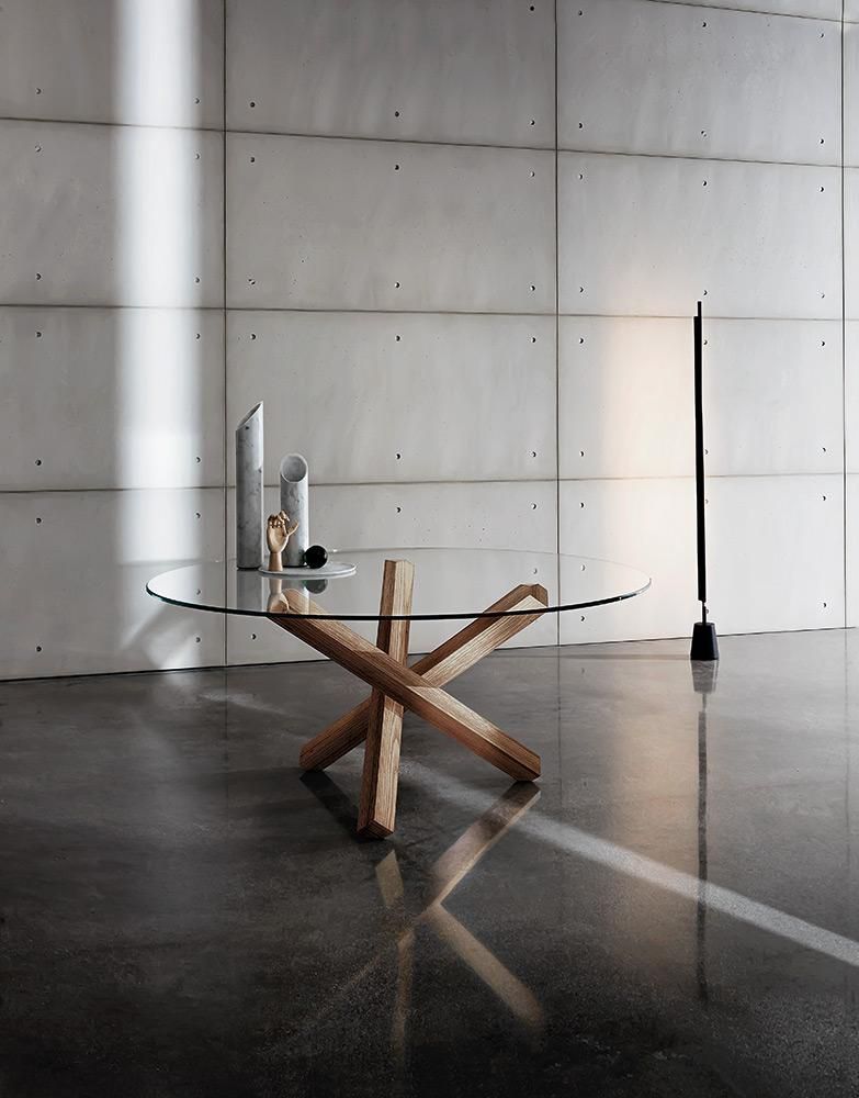 Обеденный стол с основанием из дерева с различной отделкой или из металла, полированного хрома, лака или полированной отделки. Закаленная или ламинированная столешница различных размеров, материалов и отделок. Стол с базой в разнообразной отделке, металло-хромато-лючидо, лаккато или брунито.