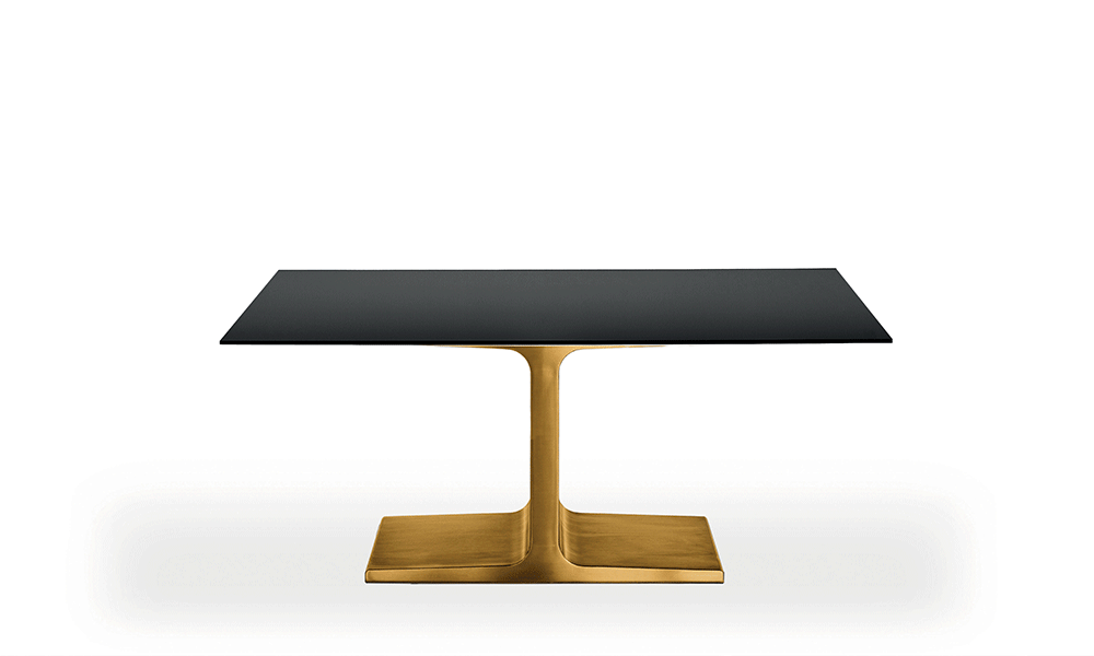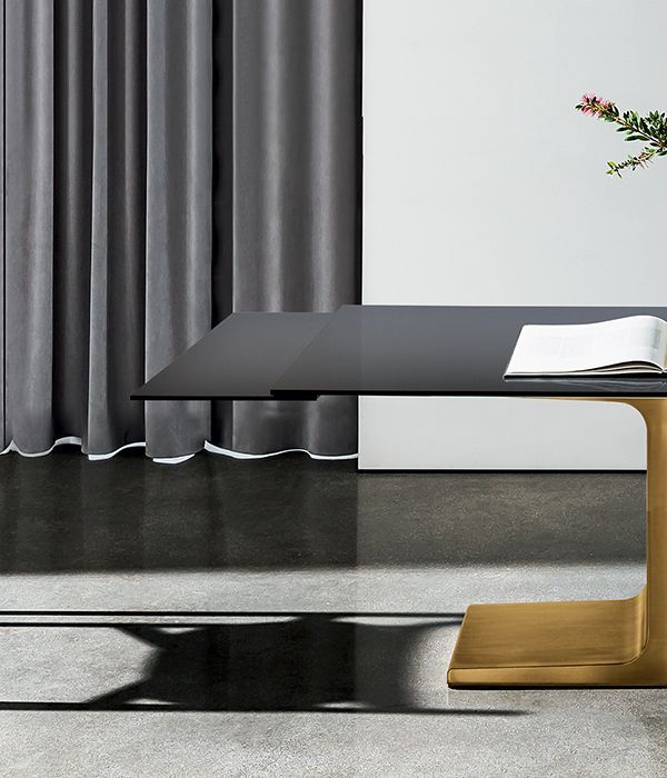 Раздвижной обеденный стол с основанием из лакированного металла, различными вариантами отделки или вороненой отделкой. Столешница из закаленного или ламинированного материала различных размеров, материалов и отделок. Раздвижная конструкция с алюминиевой отделкой.