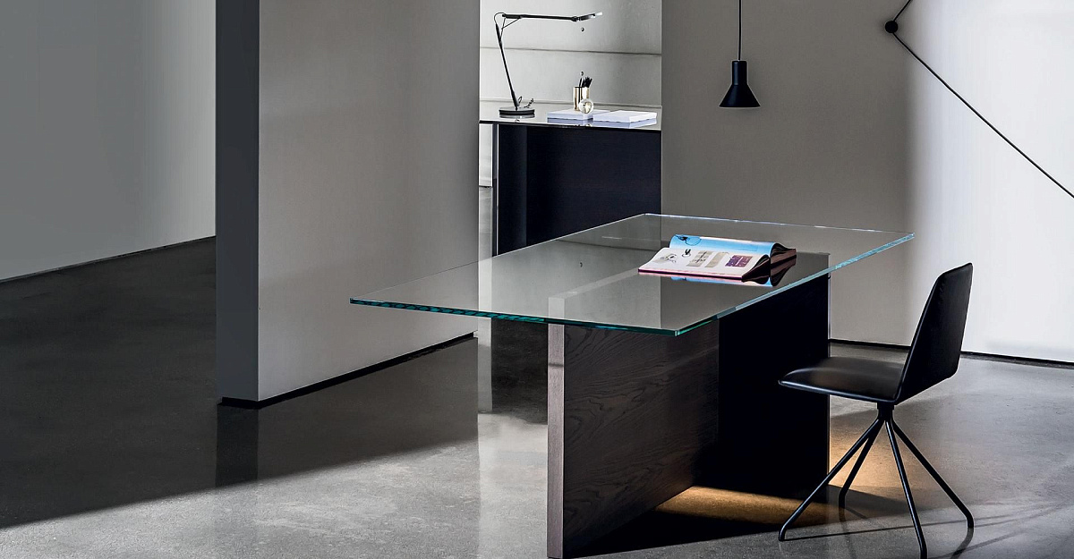 Обеденный стол со столешницей из сверхлегкого прозрачного или дымчато-бронзового ламинированного стекла. Основание состоит из деревянной вставки с различными вариантами отделки и вставки из чёрного лакированного ламинированного стекла.