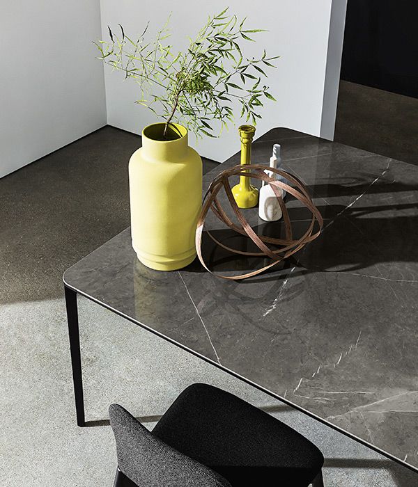 Обеденный стол с ножками из литых под давлением алюминиевых сплавов, полированной хромированной или лакированной отделкой (различные варианты отделки), а также анодированным или лакированным алюминиевым профилем (различные варианты отделки). Столешница из закалённого стекла толщиной 8 мм, лакированная или матовая, различных цветов. Столешница также доступна из MATERIA, керамики, дерева или HPL (различные варианты отделки).