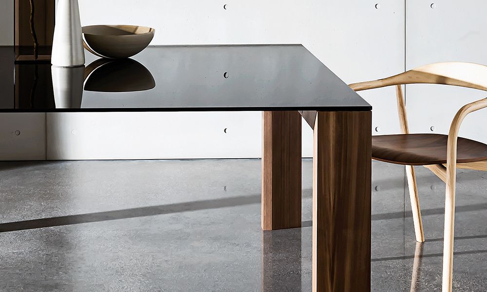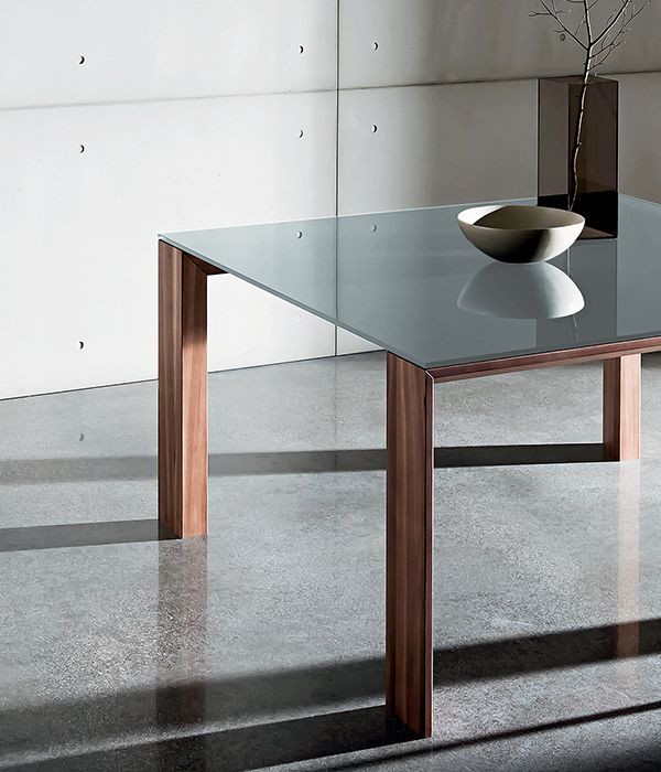 Обеденный стол с ножками и каркасом из шпона, различные варианты отделки. Столешница из закалённого стекла, лакированная или матовая, различные варианты отделки. Доступен также с керамической столешницей, различные варианты отделки.