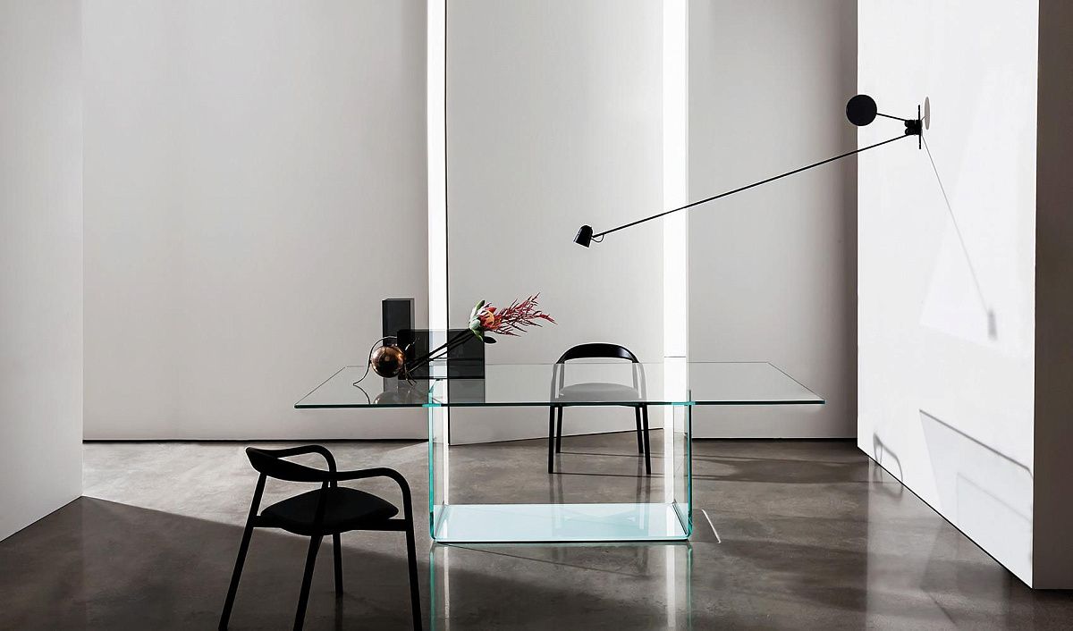 Обеденный стол с основанием из сверхлёгкого гнутого стекла и лакированной опорной частью, различные варианты отделки. Столешница из закалённого стекла или дерева, различные варианты отделки.