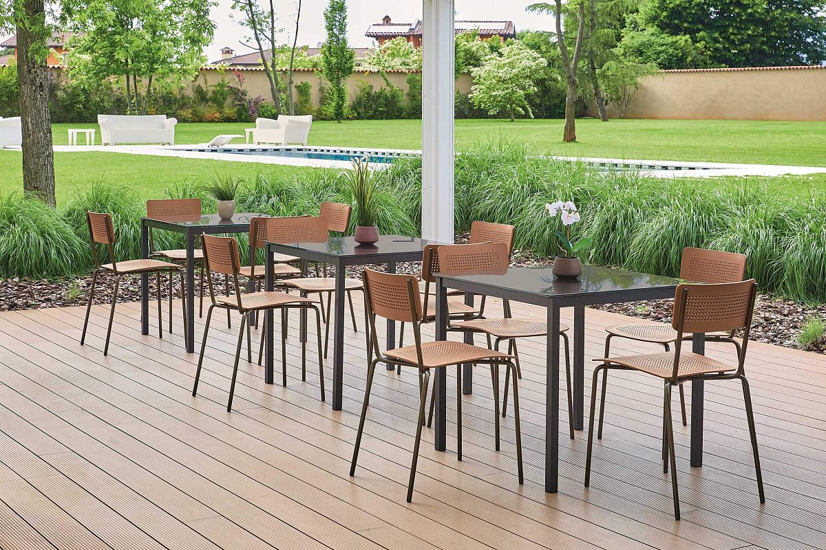 Стол нераскладной со структурой из лакированной стали, столешница из меламина, стекла и стекла и устойчивого к царапинам.
