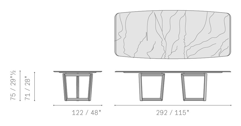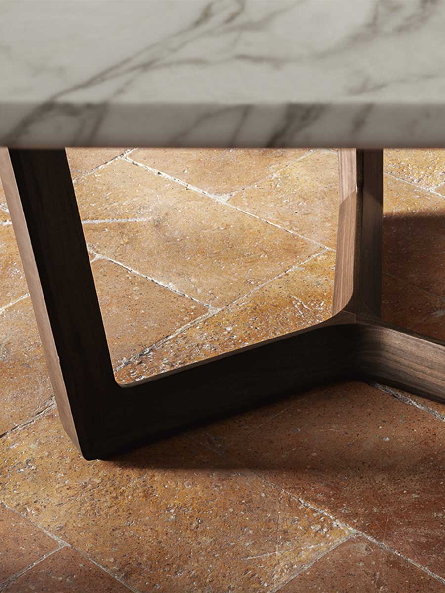 Стол Bolero Ravel имеет самонесущее основание на козлах с тремя стойками треугольного сечения. Ножки могут быть изготовлены из дерева с различными вариантами отделки. Крепёжные пластины и распорки изготовлены из стали, окрашенной в чёрный цвет. Мраморная столешница, доступная в различных вариантах глянцевой и полуглянцевой отделки, изготовлена из цельной бочкообразной плиты со скошенными краями. Глянцевая поверхность обработана полиэфирным лаком, который обеспечивает повышенную прочность и предотвращает впитывание жидкости; полуглянцевая поверхность обработана водоотталкивающим маслом для более естественного вида. Нижняя сторона мраморной столешницы усилена технической сеткой для обеспечения долговечности.