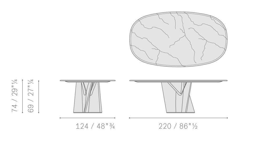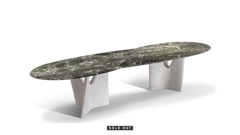 Стол Infinito∞ – это скорее произведение искусства, чем дизайнерский объект. Он не подлежит повторению и был выпущен ограниченной серией, пронумерованной и подписанной. Смещенная форма двойного овала частично напоминает взаимодополняющие формы инь и ян, частично – перевёрнутую восьмёрку, символ бесконечного совершенства и процветания: отсюда и название. Каждая ножка вырезана из цельного куска белого каррарского мрамора, обработана роботизированной рукой специальных размеров и доработана вручную, но результат совсем не тяжёлый: форма дерева, распускающегося «ветвями», выражает лёгкость и динамизм, а также подчёркивает элегантность и мощную скульптурную ценность стола. Стол Infinito∞ доступен в двух версиях: лимитированная серия из 8 экземпляров большого двойного овала размером 340 x 120 см на двух ножках. Другие 64 экземпляра изготовлены с овальной столешницей размером 220 x 124 см на одном основании. В увеличенной версии стола Infinito∞ столешница пересекается тонким лезвием из нержавеющей стали, наклонно вставленным в мрамор, служащим связующим звеном двух овальных поверхностей. Учитывая исключительность материала, серия никогда не будет воспроизведена. В центре стола под столешницей находится латунная пластина с рутениевым покрытием, на которой находится логотип Poltrona Frau, подпись дизайнера и серийный номер каждого экземпляра: от 1 до 8 для увеличенной версии и от 1 до 64 для уменьшенной версии.