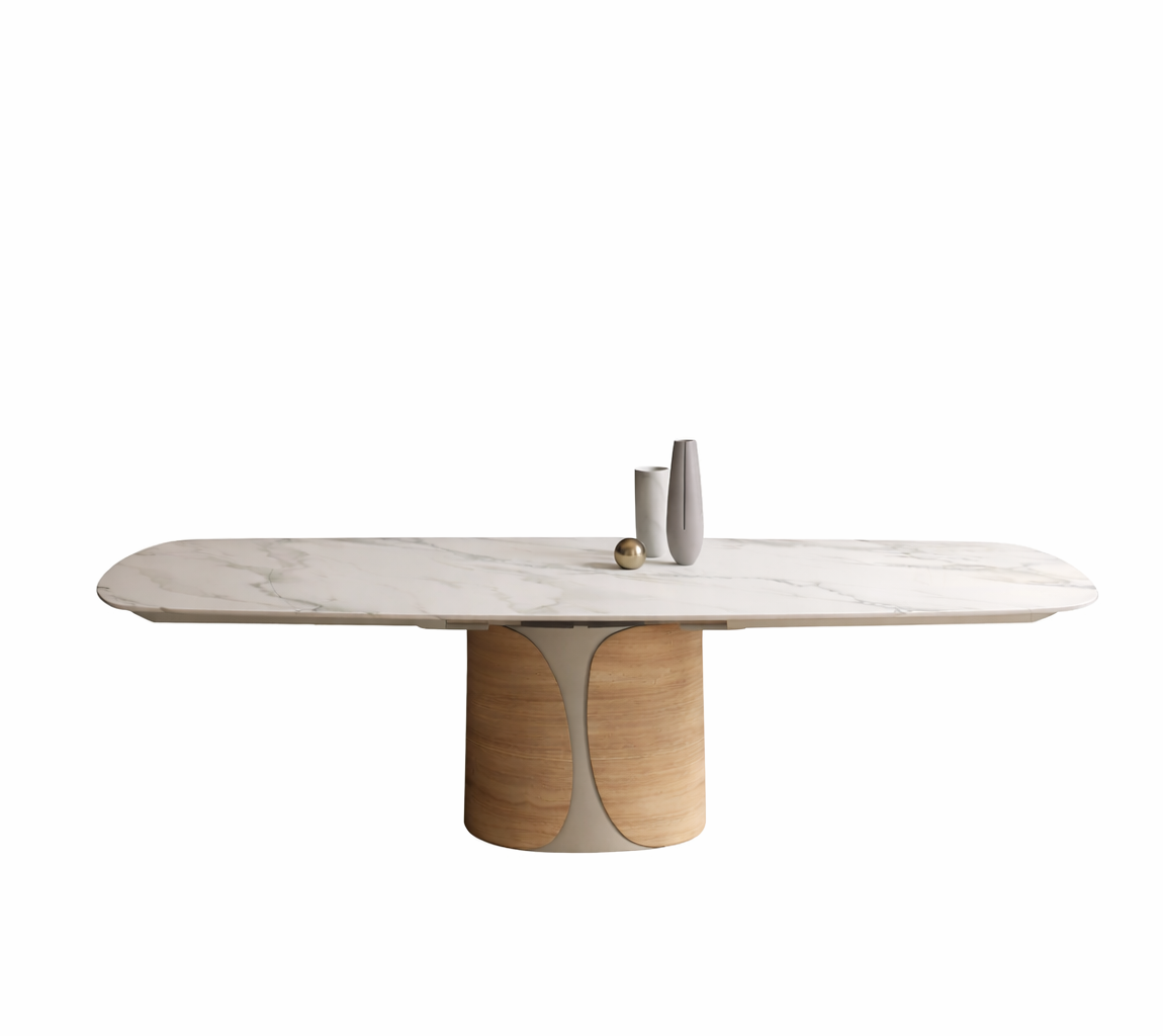 Talos — это стол, который заявляет о себе с прочной элегантностью и архитектурным присутствием. Отличительная особенность — монолитное эллиптическое основание, состоящее из двух симметричных оболочек, обнимающих центральную часть. В металлическом варианте основание выделяется изысканными цветовыми сочетаниями, создающими визуальные вибрации или утончённые эффекты тон в тон. В сочетании металла и дерева тёплая фактура древесины сочетается с блеском металлических покрытий, создавая гармоничный баланс между материальностью и строгостью. В любом исполнении Talos сохраняет свою сценографическую идентичность и главенствующую роль, определяя пространство с харизмой.