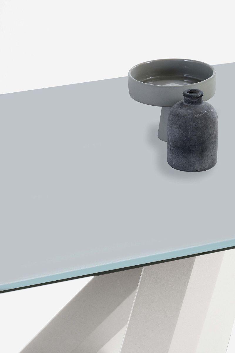 Стол раскладной бочкообразная столешница со структурой из лакированной стали, столешница и удлинители из стекла или стекла, устойчивого к царапинам.