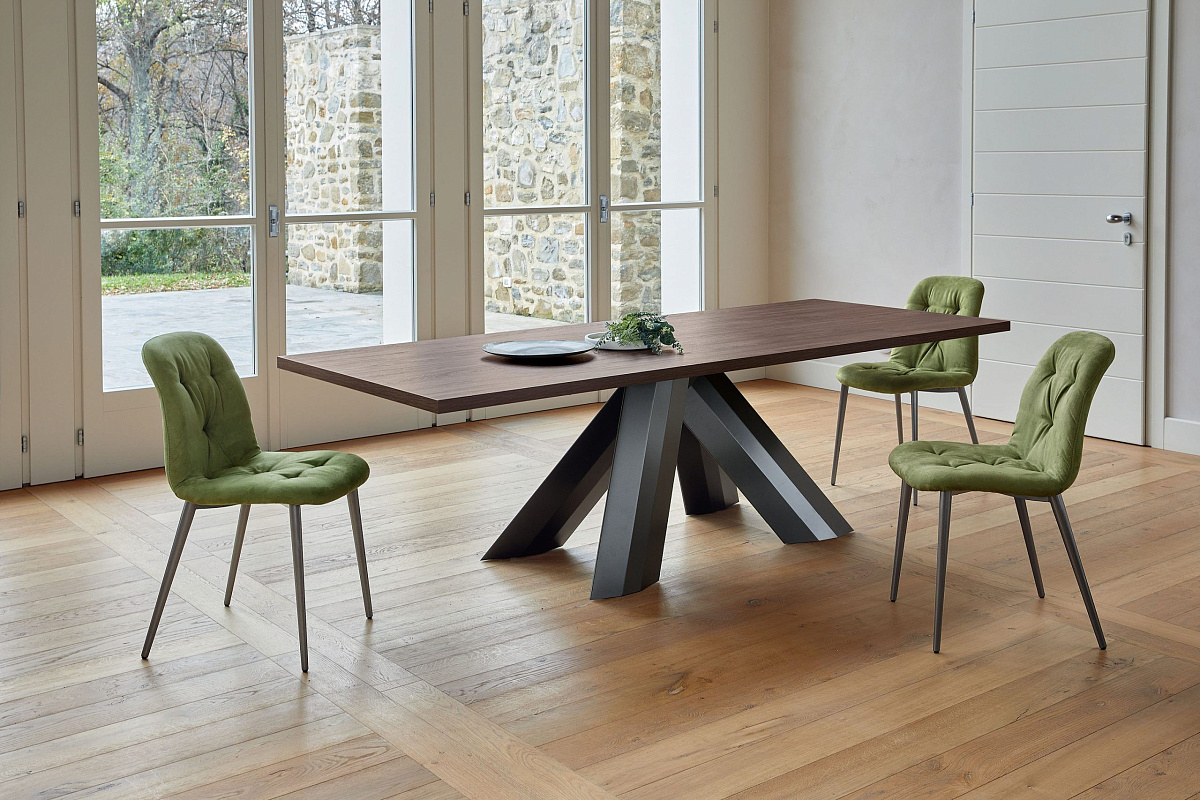 Стол прямоугольный нераскладной со структурой из лакированной стали, столешница из шпона, шпона с краями из массива, стекла или стекла, устойчивого к царапинам.