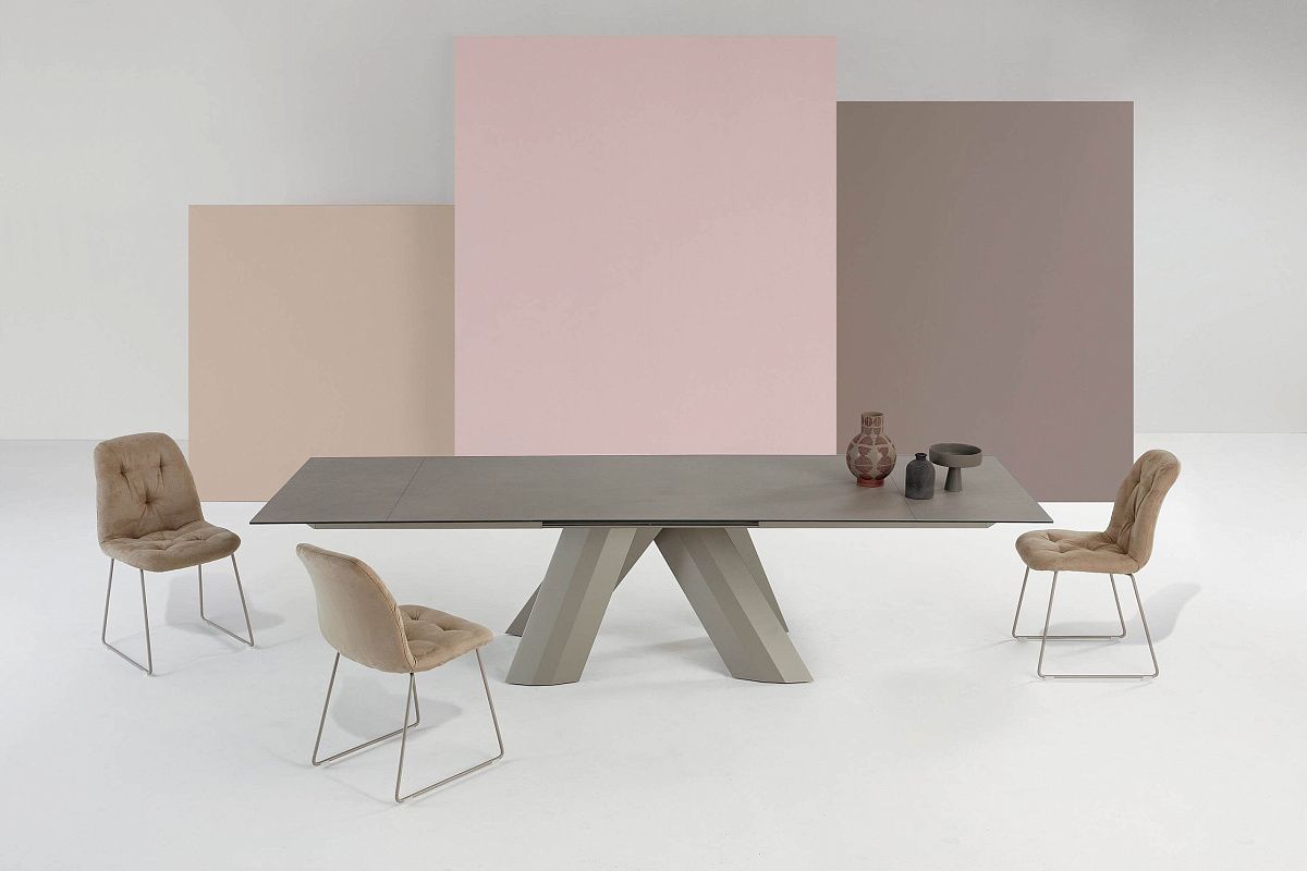 Стол раскладной прямоугольный со структурой из лакированной стали. Столешница и удлинители из меламина, суперкерамики и супермрамора.