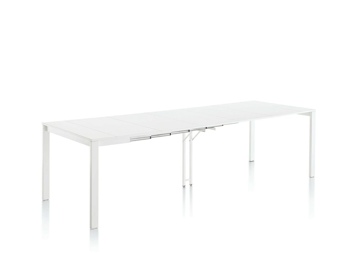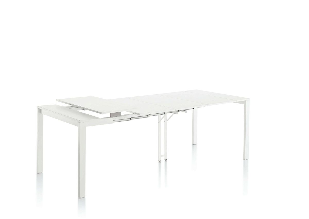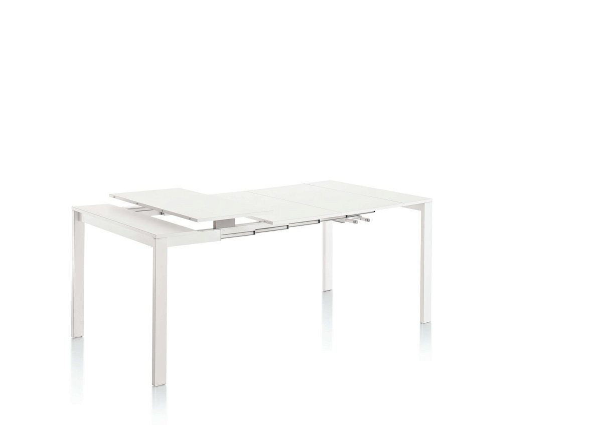 Стол-консоль со структурой из лакированной или хромированной стали, столешница и раскладки из меламина.