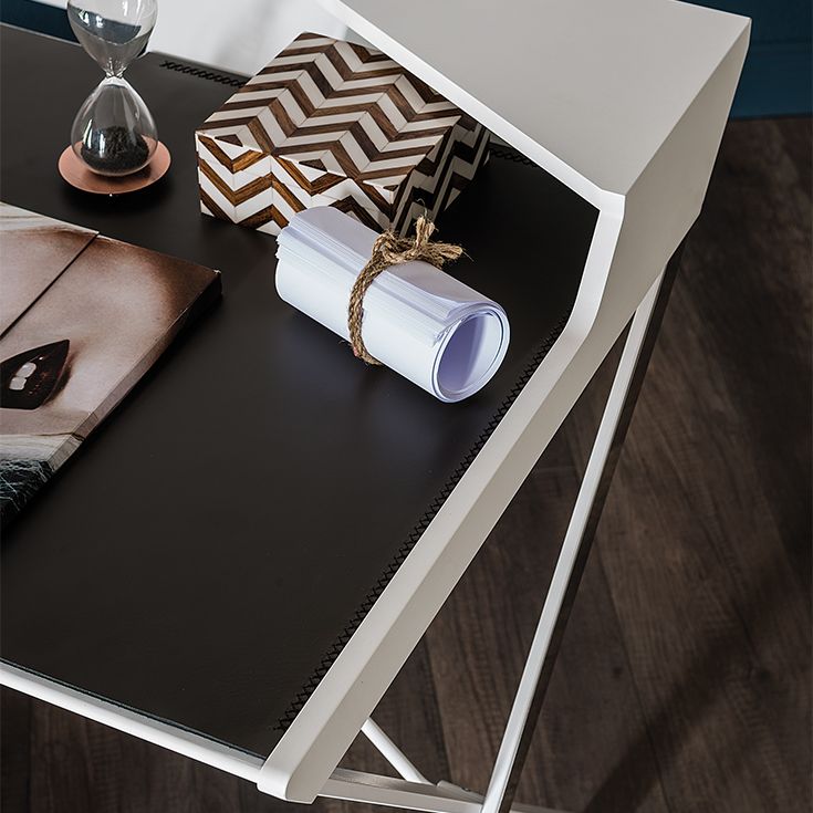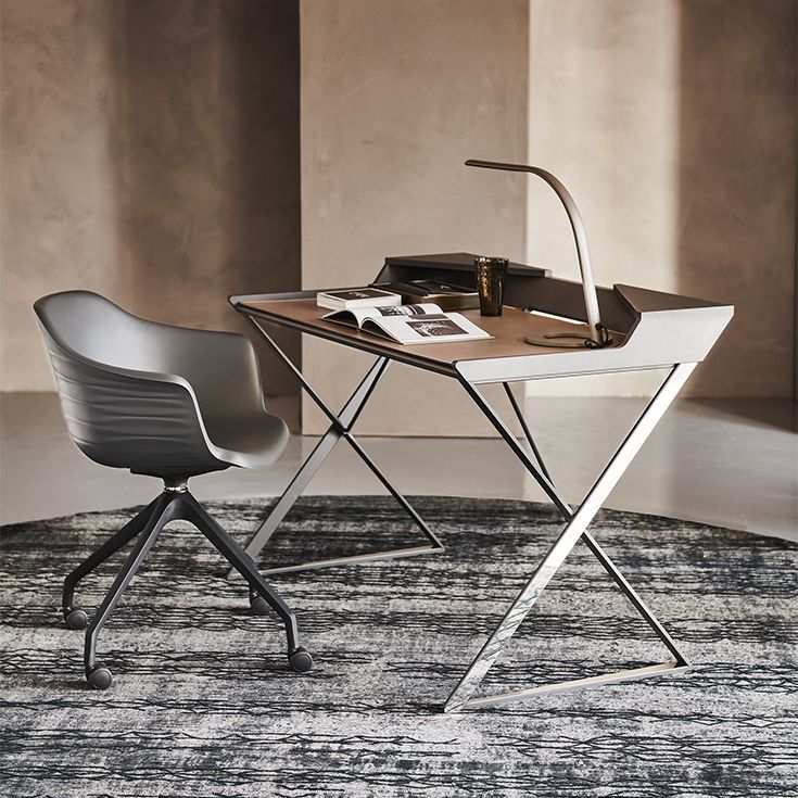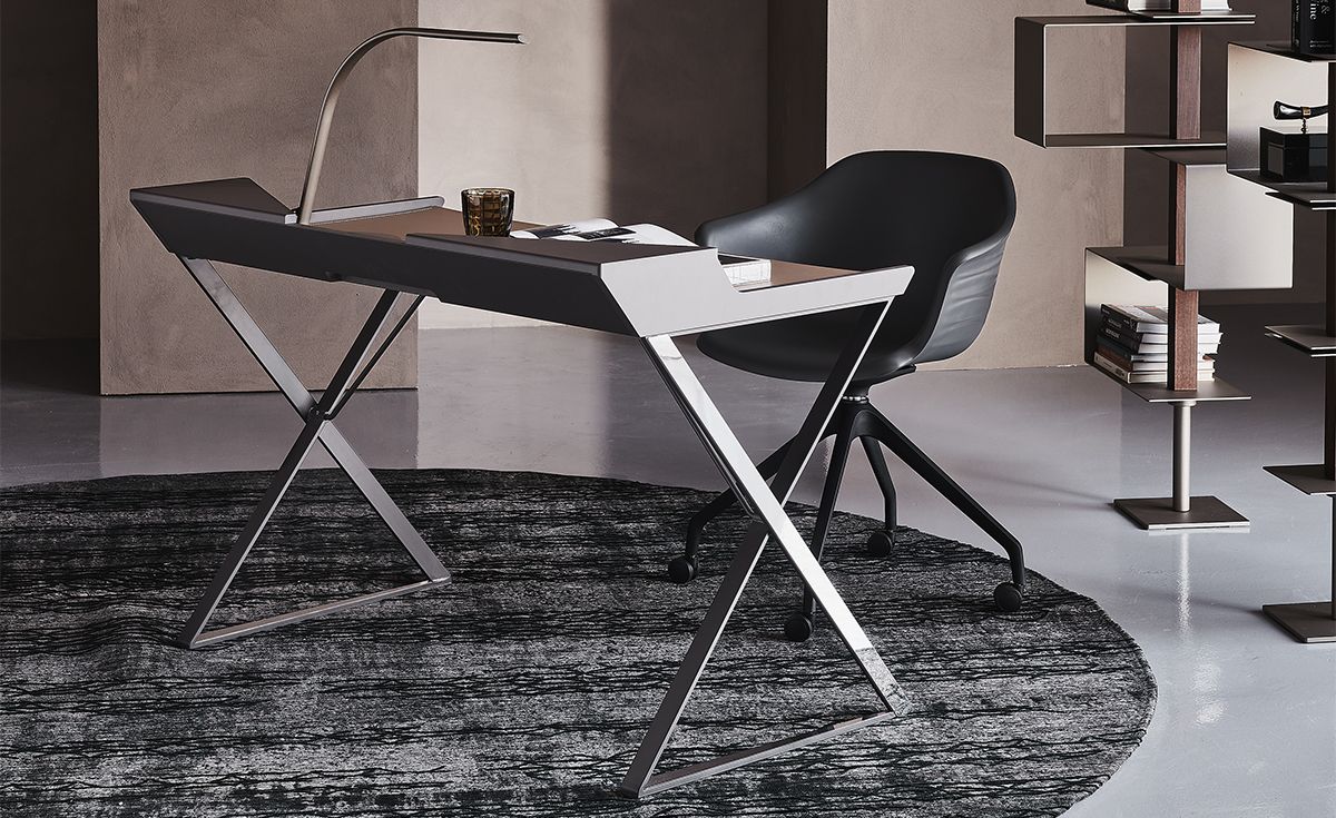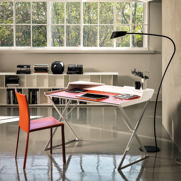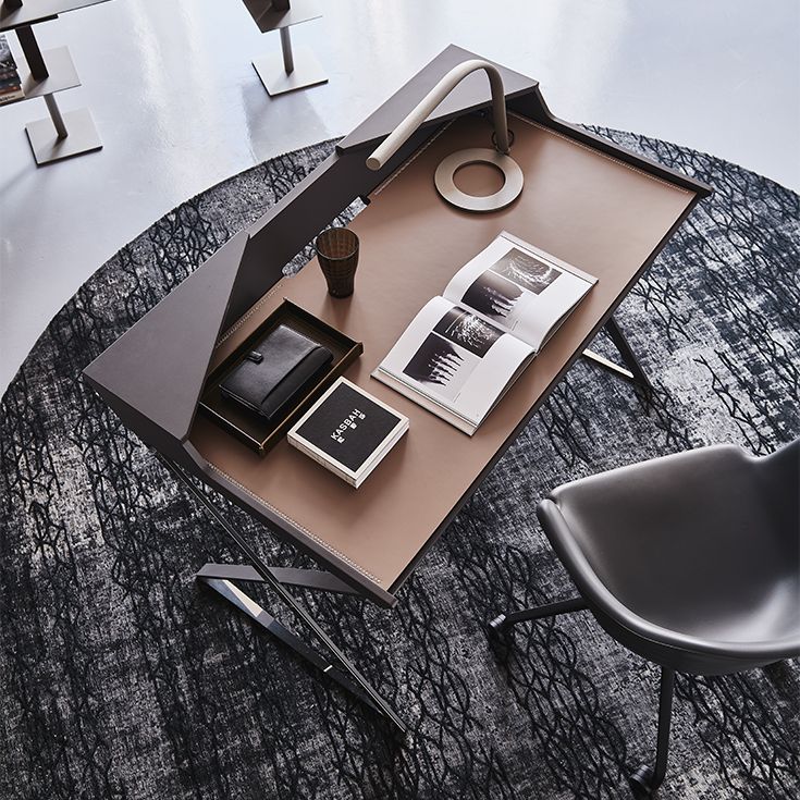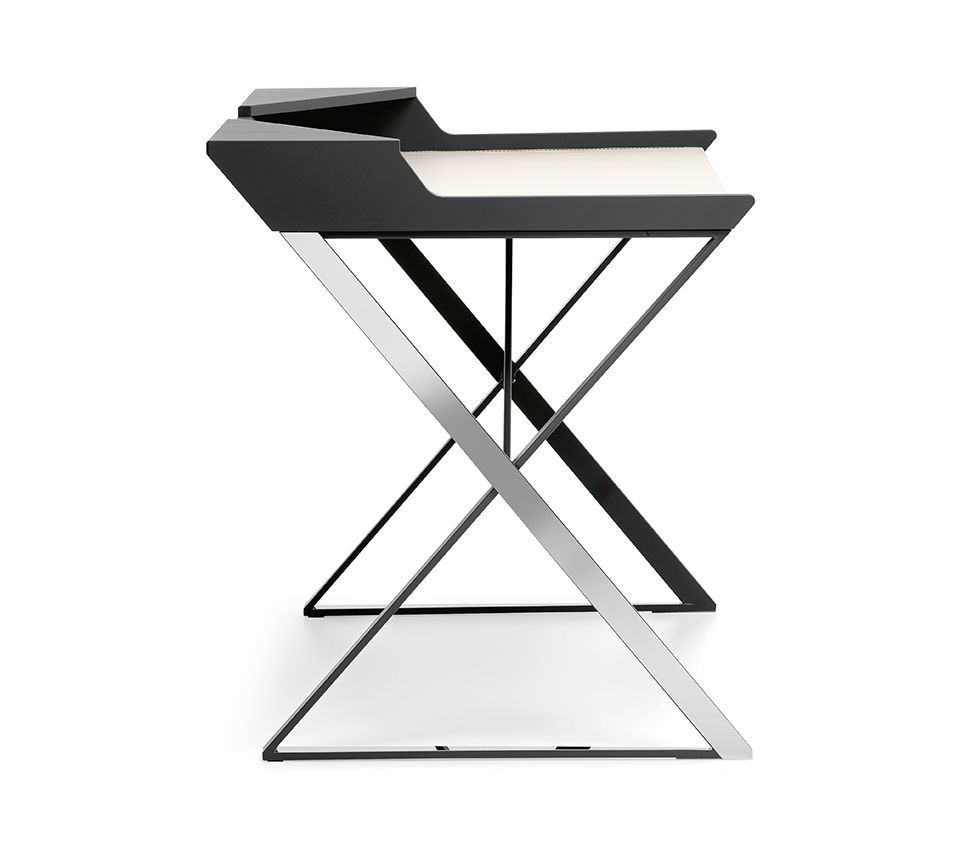Qwerty - это современный письменный стол уменьшенного размера, разработанный Андреа Лукателло, идеально подходит для домашнего офиса или уголка для чтения. Выделяющийся геометрическими линиями, создающими ощущение тщательно продуманного баланса, дизайнерский письменный стол Qwerty, как будто, парит над тонкими стальными ножками, скрещенными в форме X. Кожаная накладка, доступная в различных изысканных цветах, дополняет стальную поверхность, делая ее удобной и элегантной.