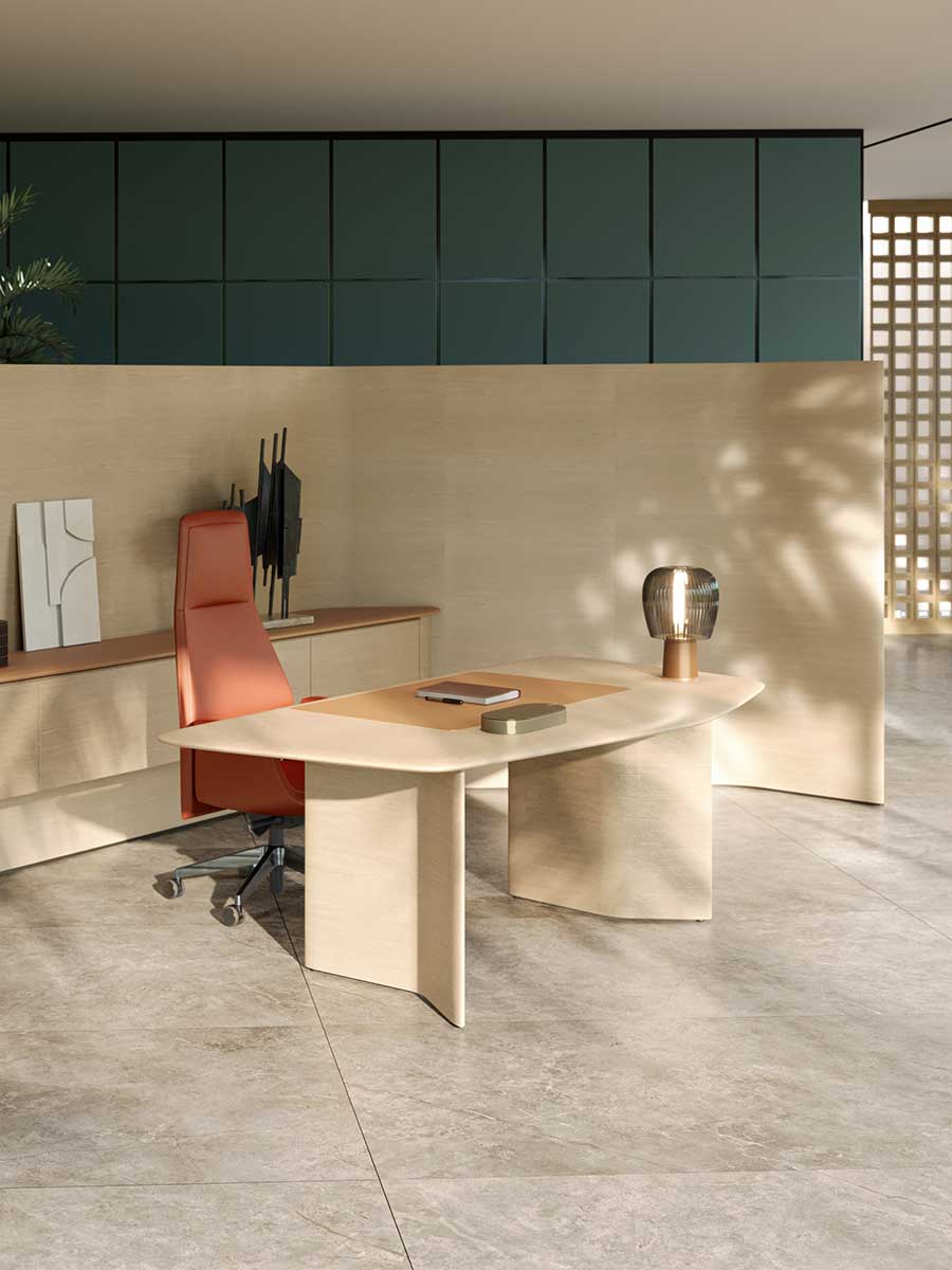 Столы Trust выходят за рамки традиционного стола, разделяя пространство и создавая ощущение статичности. Столешница лишена острых углов, создавая ощущение открытости и диалога. Сужающиеся края облегчают позу работающего за столом, обеспечивая комфортную поддержку. Система представлена в двух вариантах, каждый из которых представлен в трёх размерах. Стол Trust Iconic с его волнистым и неровным профилем способствует совместному использованию, предлагая разные стороны и рабочие места. Вариант стола Trust Regular сохраняет классическую прямоугольную форму, сочетая её с плавными линиями. В промежуточном размере обе модели также доступны в асимметричном исполнении: с одной стороны он опирается на ножку, а с другой – на тумбу. Стол Trust Iconic также доступен в «большом» размере – универсальном гибриде письменного стола и стола для совещаний. В то же время, Trust Regular также доступен в «малом» размере, идеально подходящем для создания уютного личного рабочего места или домашнего стола. Доступные варианты отделки подчеркивают изящную и лёгкую геометрию столешниц. Последний вариант может быть дополнен кабельными отсеками или, в кожаном исполнении, дверцей для организации кабелей. Столешница выполнена из Techno Wood с рабочей поверхностью из кожи или шорно-седельной кожи, или, в качестве альтернативы, столешница полностью обтянута кожей или шорно-седельной кожей. Полное отсутствие швов, благодаря мастерской обработке, придаёт ему одновременно высокотехнологичный и ремесленный вид. Ножки также выполнены из кожи/шорно-седельной кожи или Techno Wood, что позволяет укладывать кабели. Все столы, за исключением Small, могут быть дополнены панелью для укладки кабелей. Система организации кабелей поставляется и настраивается в соответствии с выбранными и указанными заказчиком электрическими устройствами.