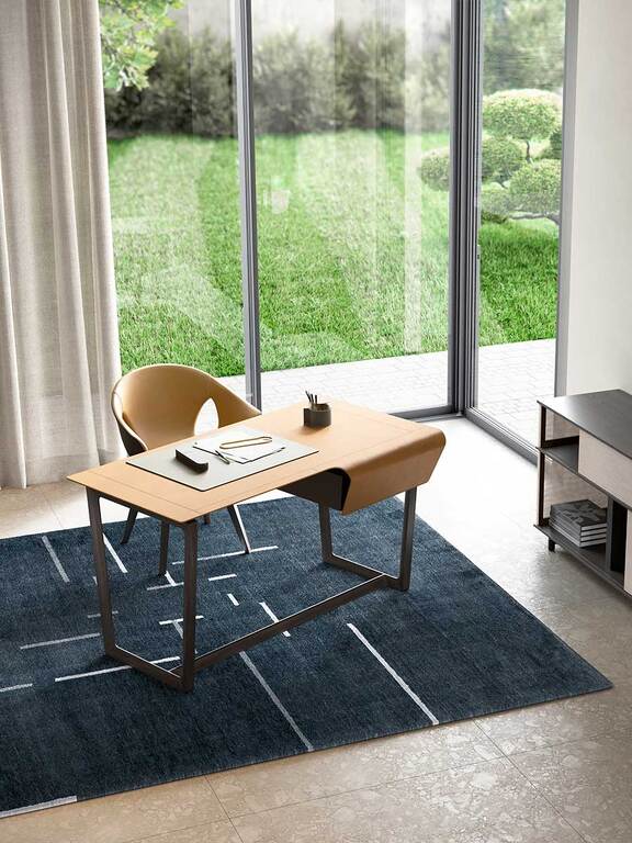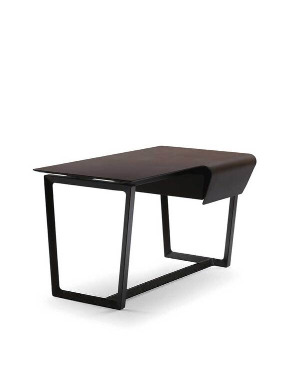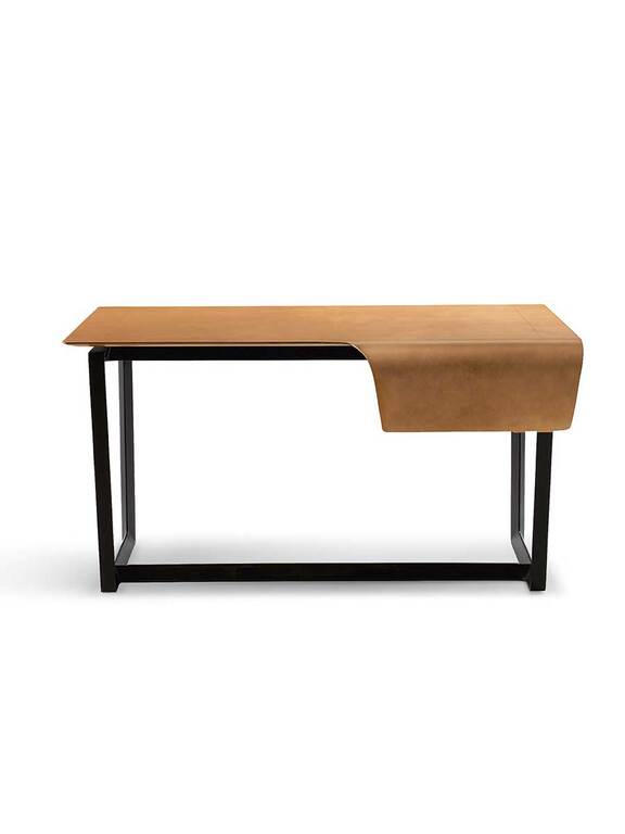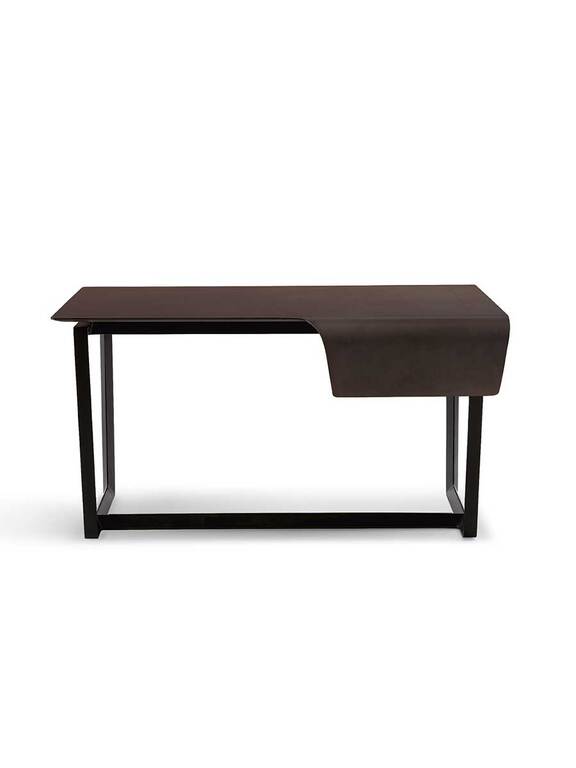 Структура стола Fred выполнена из массива ясеня с морилкой венге или мока и треугольным сечением, что подчеркивает его легкость. Тот же материал и отделка у ящика, который завершает стол, установленного на металлических направляющих с механизмом плавного закрывания. Поверхность покрыта цельным куском кожи Cuoio Saddle Extra толщиной 4 мм без каких-либо разделений или прострочки. Необработанный шов обработан защитным воском и красителем. Металлические аксессуары с гальванической обработкой цвета серой бронзы и защитным лаком.