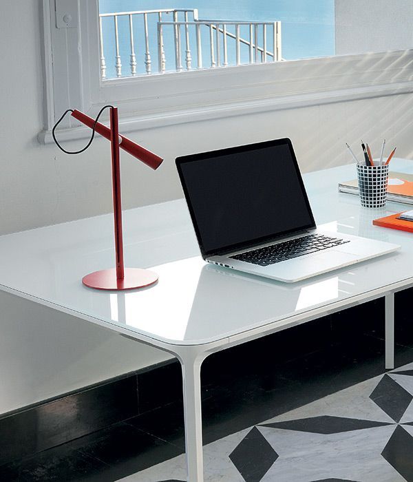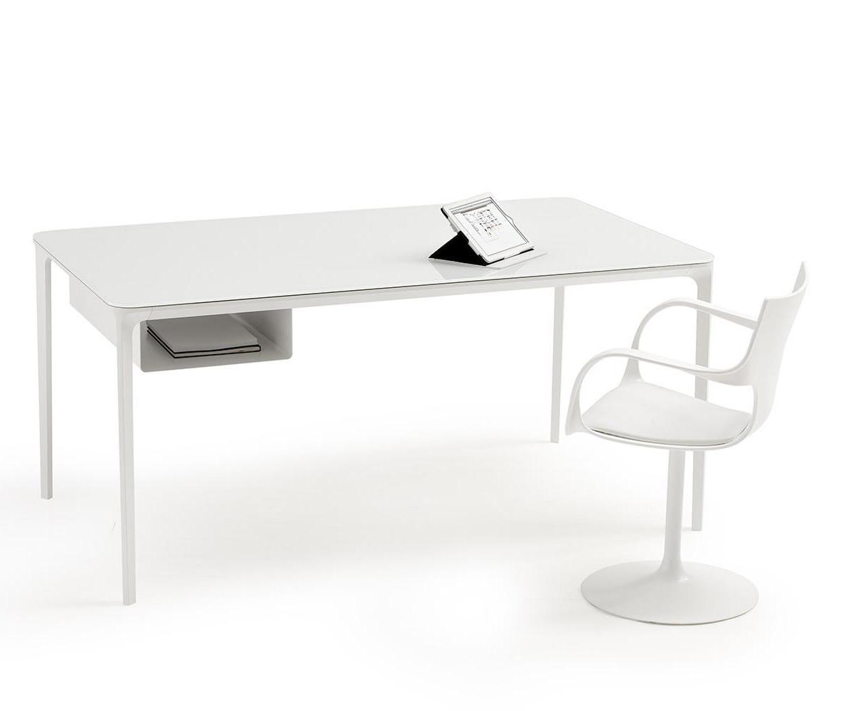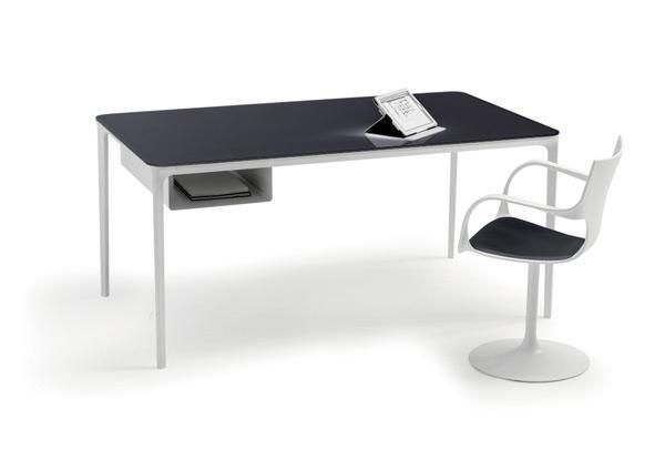 Обеденный стол с ножками из литых под давлением алюминиевых сплавов, полированной хромированной или лакированной отделкой (различные варианты отделки), а также анодированной или лакированной (различные варианты отделки), алюминиевой структурой. Столешница доступна из закалённого стекла толщиной 8 мм, лакированного или матового (различные цвета), или из дерева, керамики или HPL (различные варианты отделки). Лоток для документов из лакированного алюминия (различные цвета).