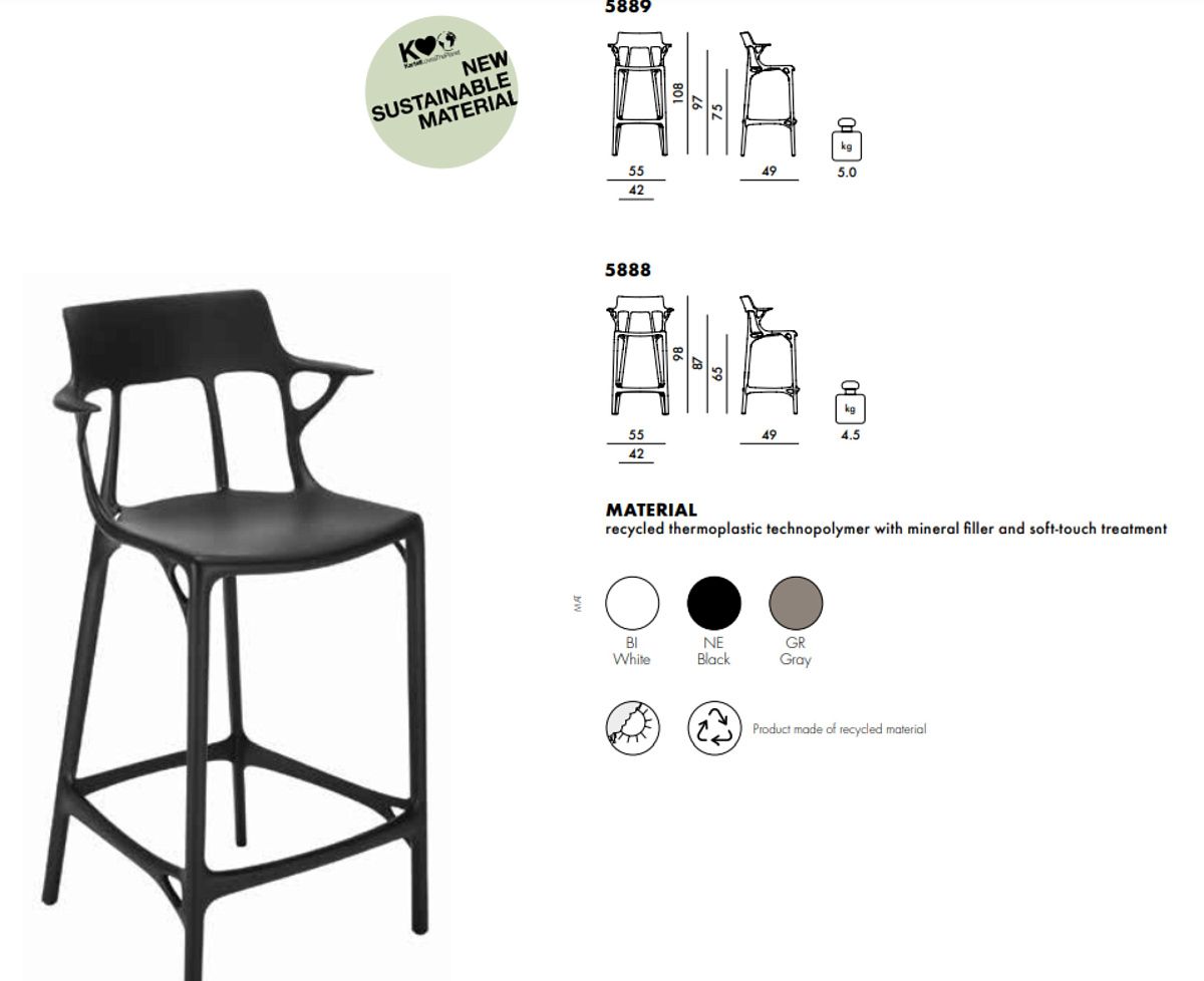 A.I. Семья растет, с добавлением A.I. STOOL RECYCLED: продукт, изготовленный из переработанного материала, с четким акцентом на комфорт благодаря широкому, уютному сиденью. Доступен в двух вариантах высоты для удовлетворения любых потребностей. Дополнительная ценность A.I. заключается в том, что это первое семейство продуктов, созданное искусственным интеллектом в ответ на вклад, полученный от дизайнера (Филипп Старк) и ноу-хау компании (Картелл). В частности, творческое мышление, ноу-хау компании и искусственный интеллект объединились для разработки модели стула, основанной на алгоритме, который учитывает исходное задание дизайнера, а компания представляет собой удобный продукт с необходимой структурной прочностью и надежностью, одновременно поддерживая одну из главных ценностей Kartell: быть литым промышленным продуктом выдающегося эстетического качества.