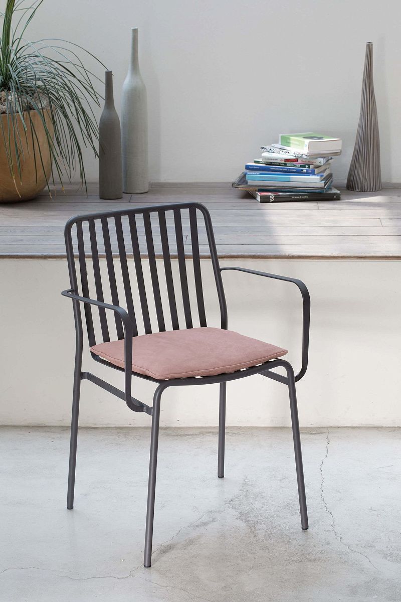 Штабелируемый стул с подлокотниками со структурой из лакированной стали для использования внутри помещений.
