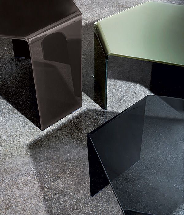 Шестиугольный журнальный столик из гнутого сверхлегкого стекла, дымчатого или лакированного в однотонном или двухцветном исполнении однозначно станет оригинальным дополнением к современному интерьеру гостиной.