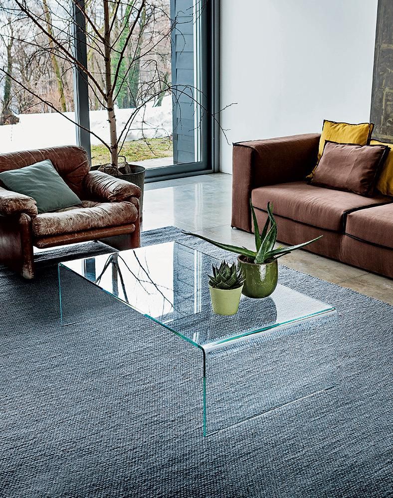 Журнальный столик из дымчатого, сверхлегкого прозрачного или лакированного однотонного или двухцветного гнутого стекла.