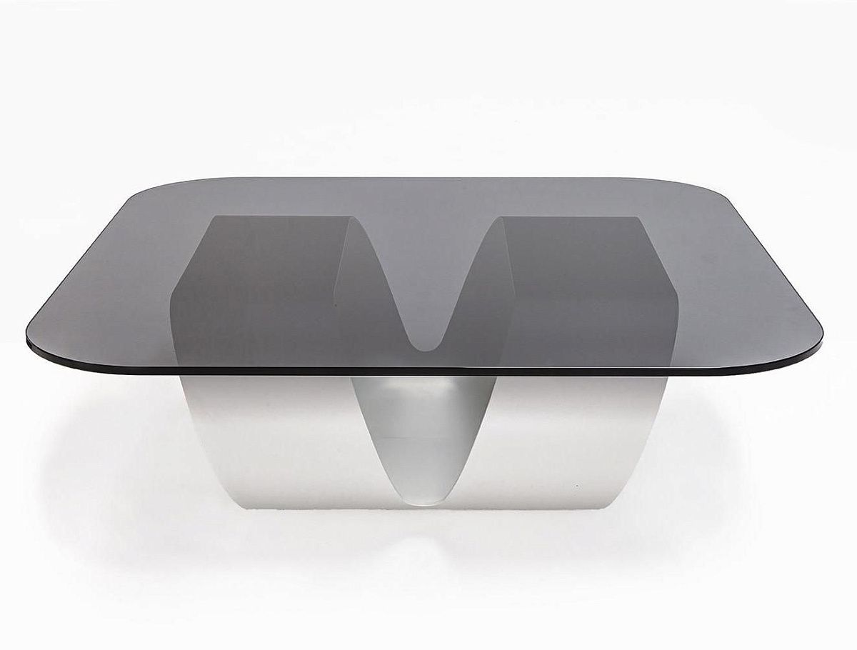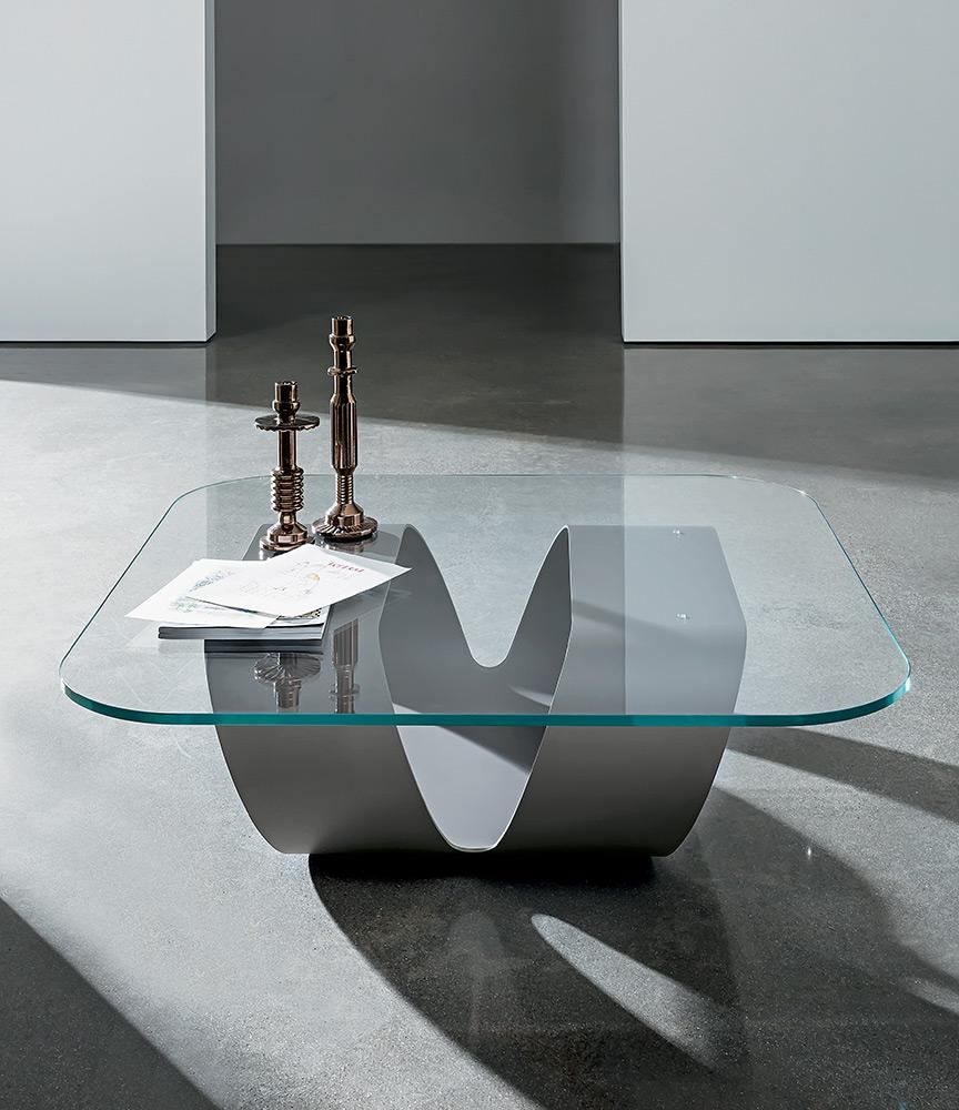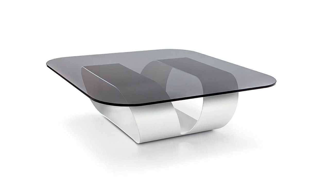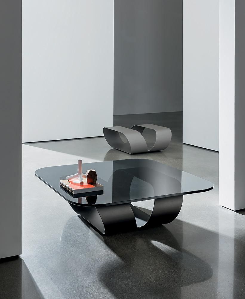 Один изогнутый металлический лист складывается, образуя кольцо, которое растет, развивается и расширяется в двух направлениях, которые одновременно являются двумя точками опоры для стекла, завершающего журнальный столик.