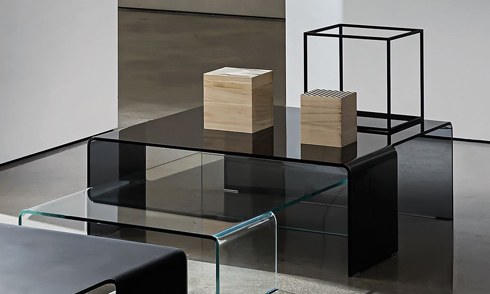 Сверхлегкий журнальный столик из дымчатого или лакированного однотонного или двухцветного гнутого стекла.