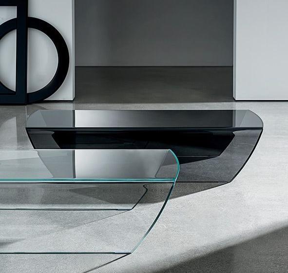 Сверхлегкий журнальный столик из дымчатого или лакированного однотонного или двухцветного гнутого стекла.