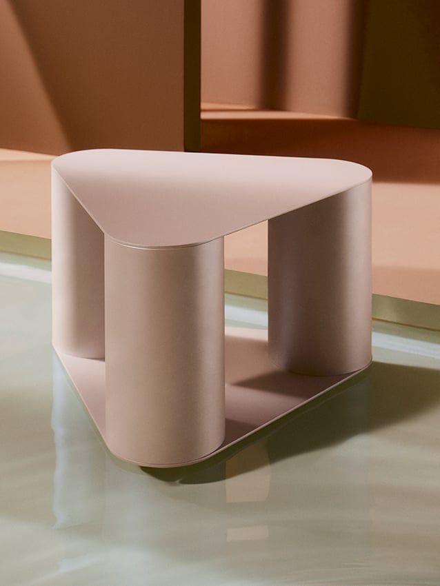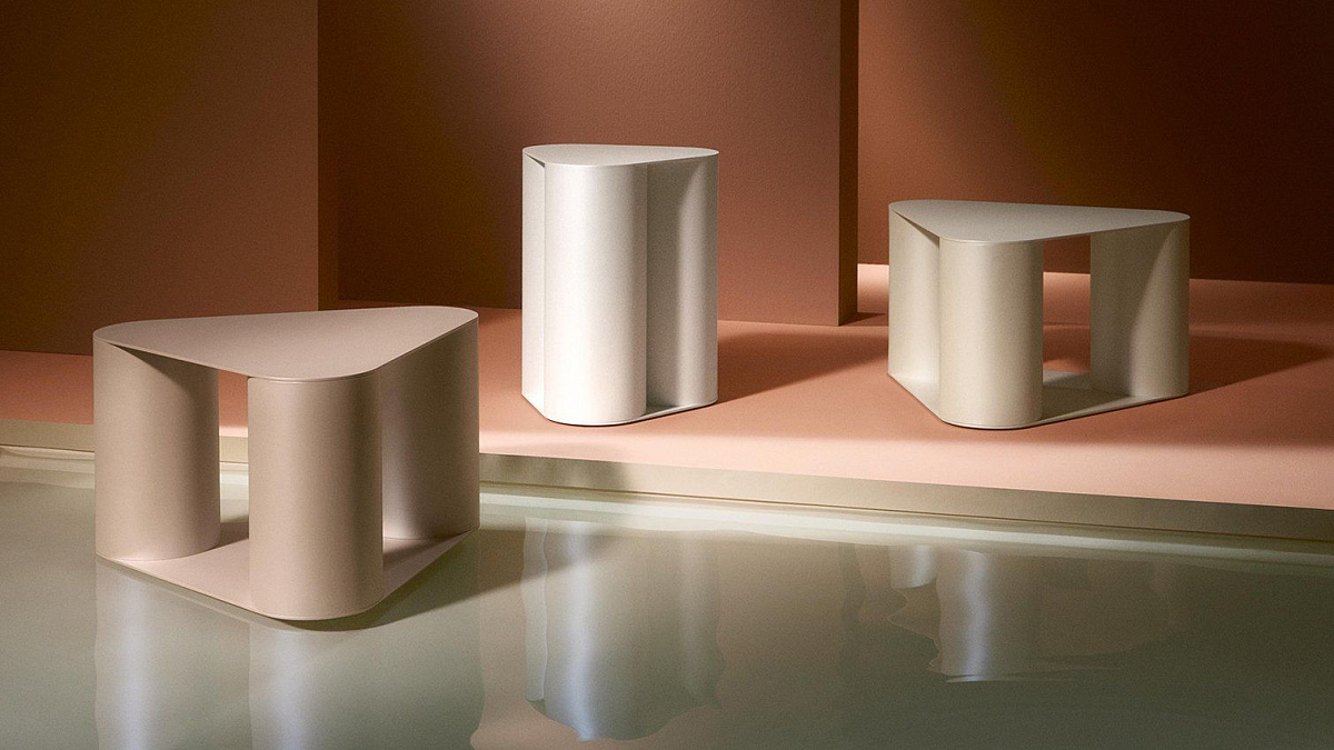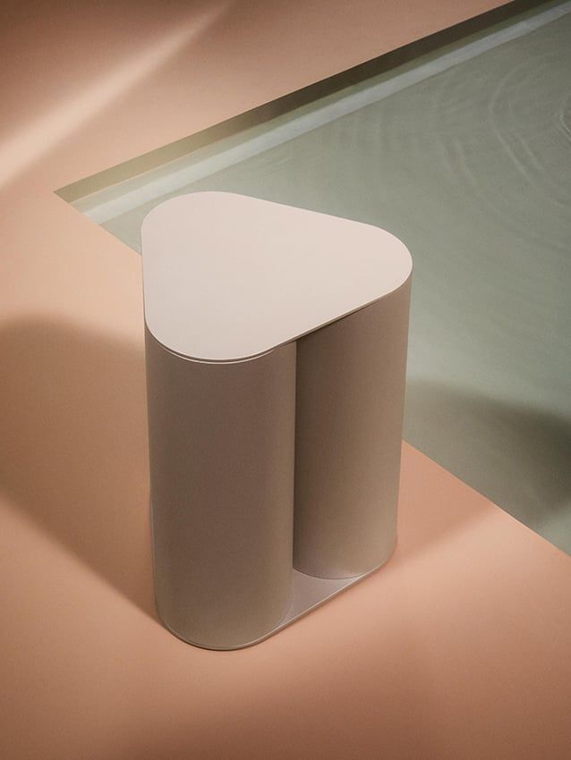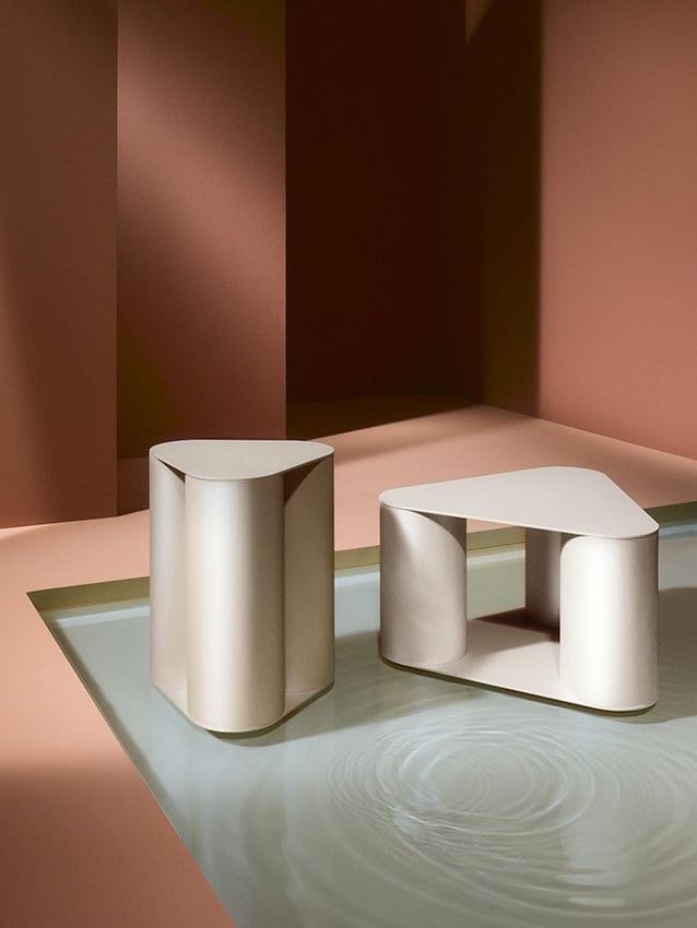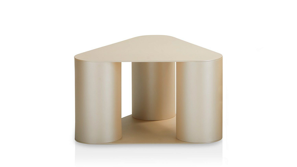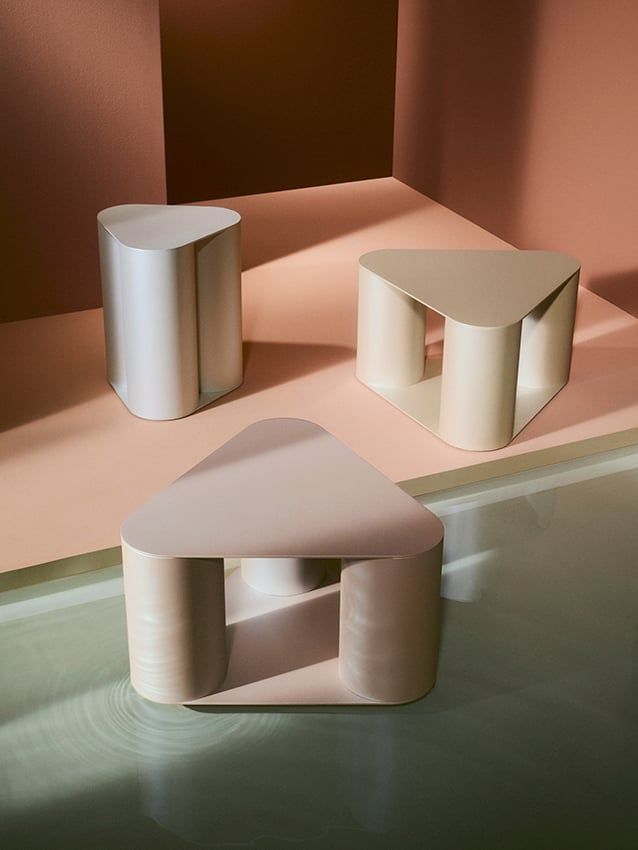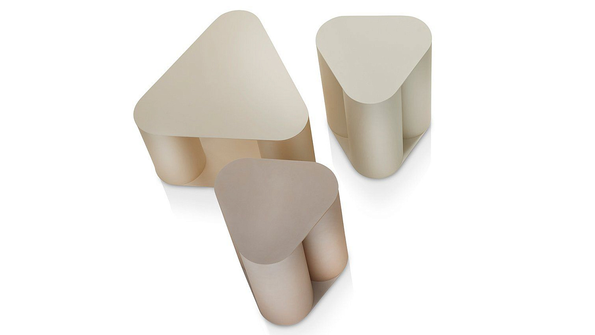Коллекцию характеризуют две треугольные поверхности со скругленными краями, разделенные тремя опорными цилиндрами.