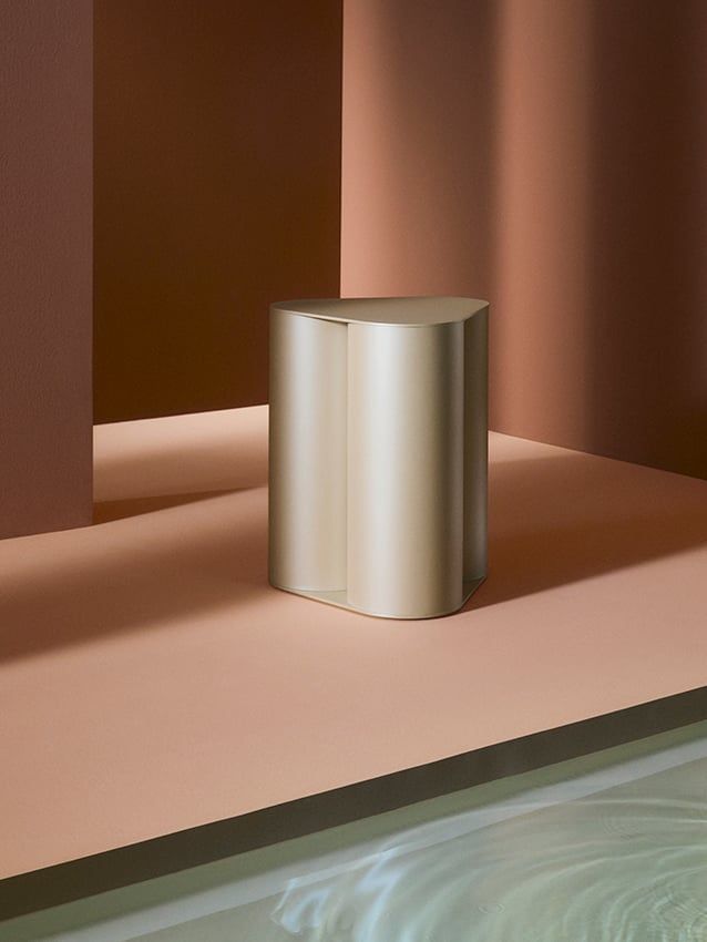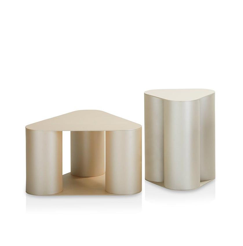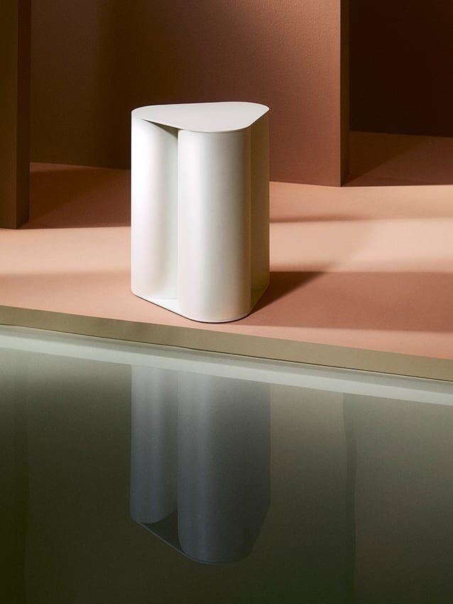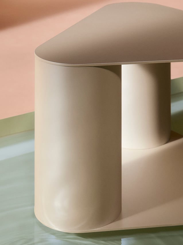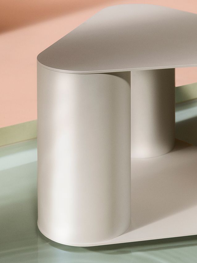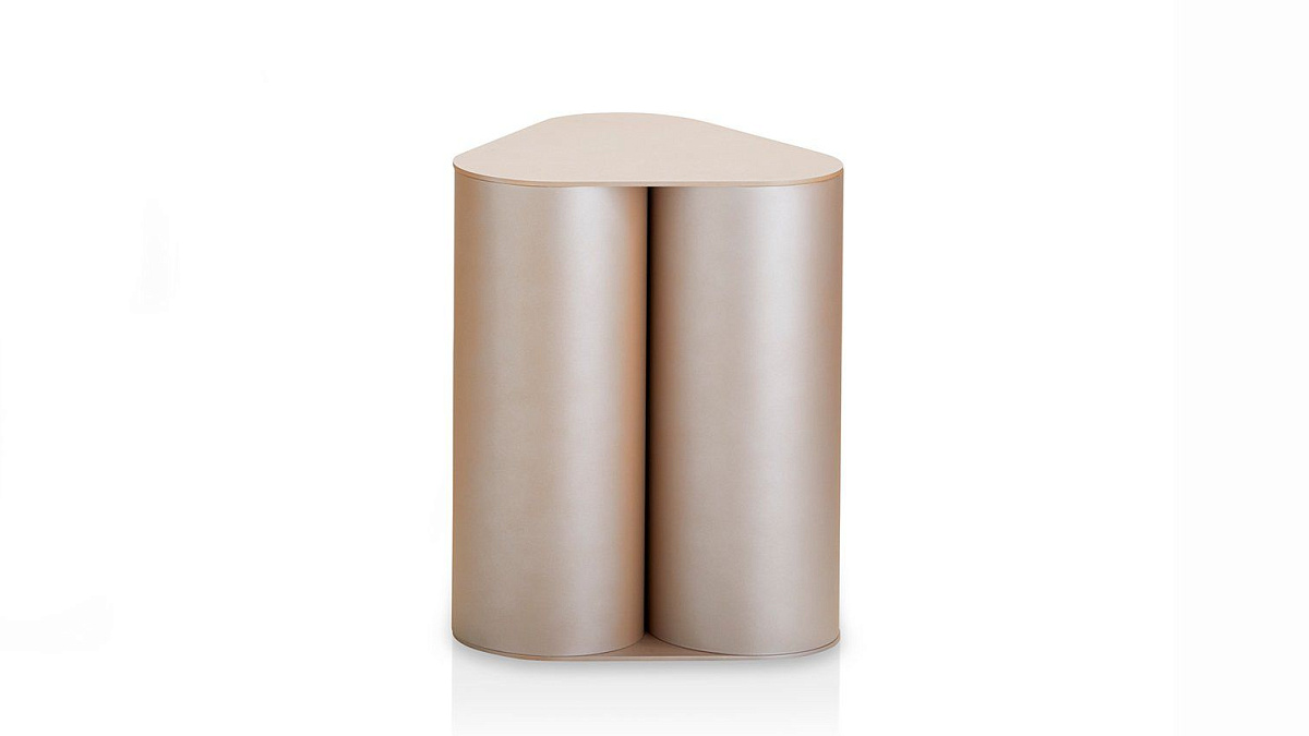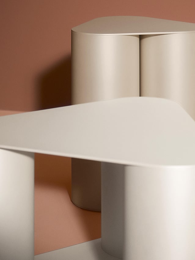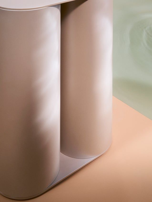 Коллекцию характеризуют две треугольные поверхности со скругленными краями, разделенные тремя опорными цилиндрами.