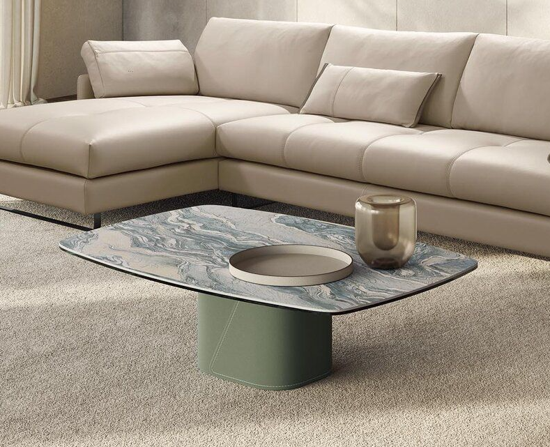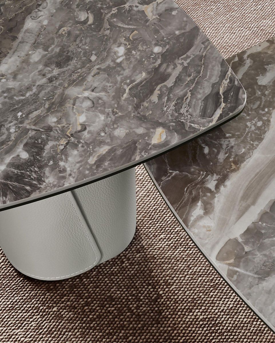 Основания из гнутого дерева искусно обтянуты кожей; столешницы из стекла, керамики и мрамора доступны в различных размерах