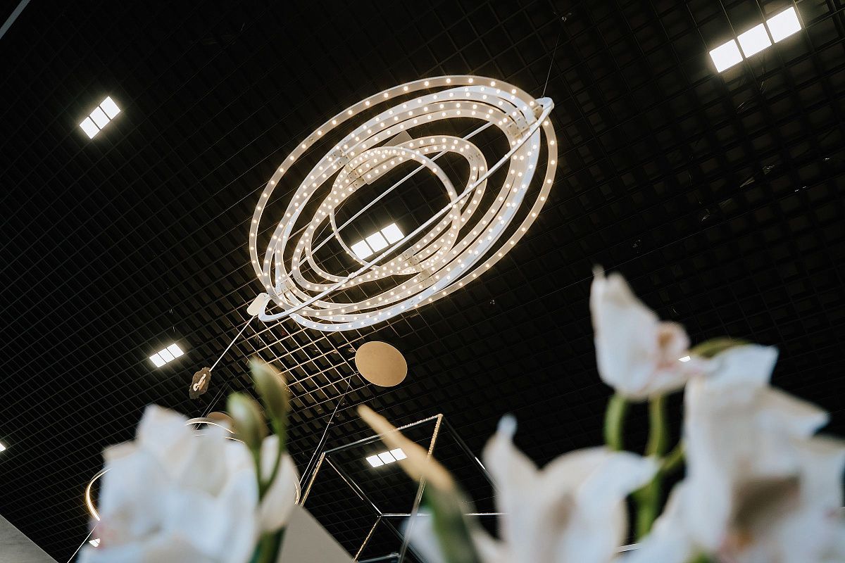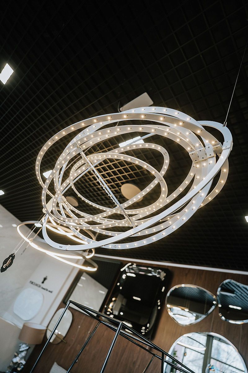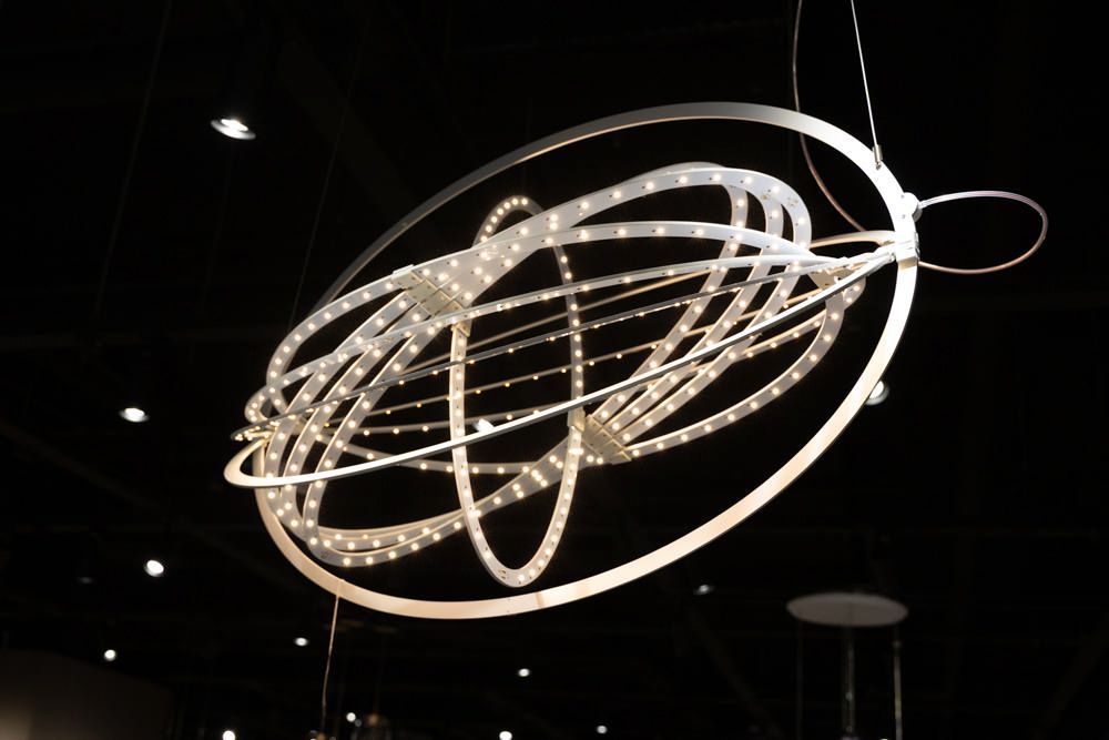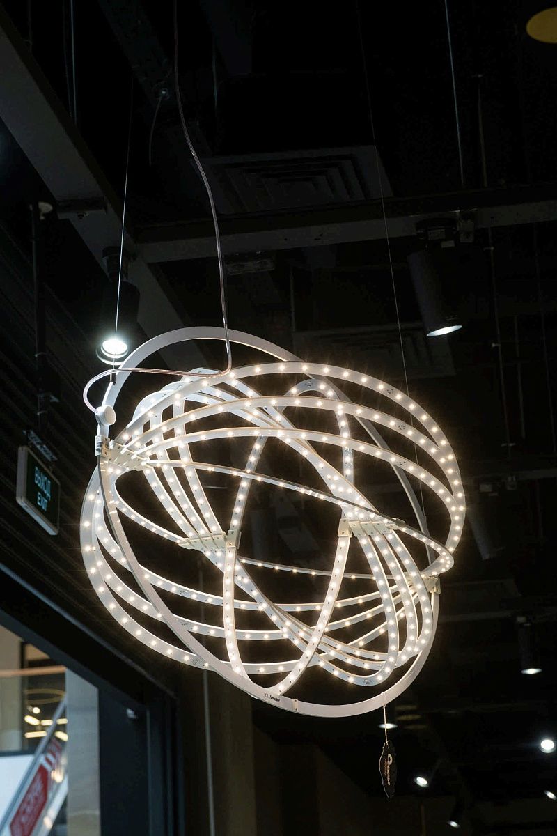 Светильник состоит из 9 поворотный тонких эллипсов со светодиодами, которые вращаются вокруг оси конструкции, позволяя изменять форму светильника.