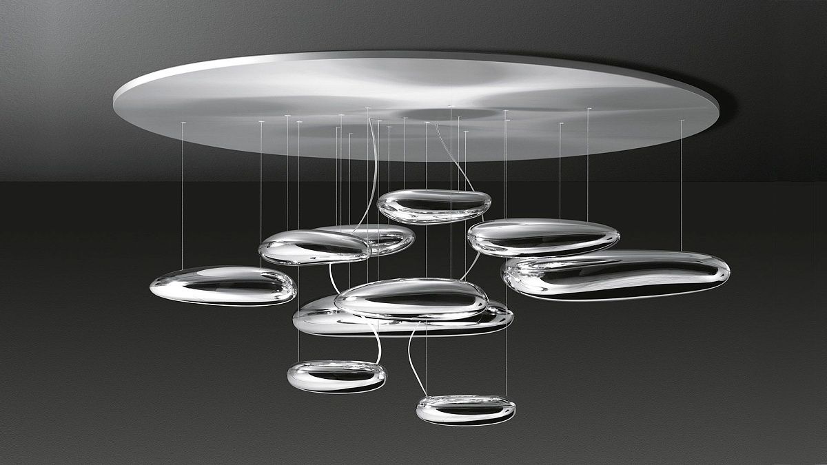 Футуристичная коллекция светильников Mercury выглядит как хаотичный ряд крупных камней, плавающих под алюминиевым диском, отражаются в нём самом и друг в друге, отражая свет между своими гладкими биоморфными поверхностями. Днём это скульптура, отражающая динамику естественного освещения и движение людей вокруг неё.