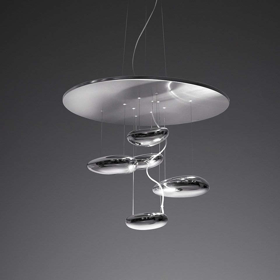 Футуристичная коллекция светильников Mercury выглядит как хаотичный ряд крупных камней, плавающих под алюминиевым диском, отражаются в нём самом и друг в друге, отражая свет между своими гладкими биоморфными поверхностями. Днём это скульптура, отражающая динамику естественного освещения и движение людей вокруг неё.