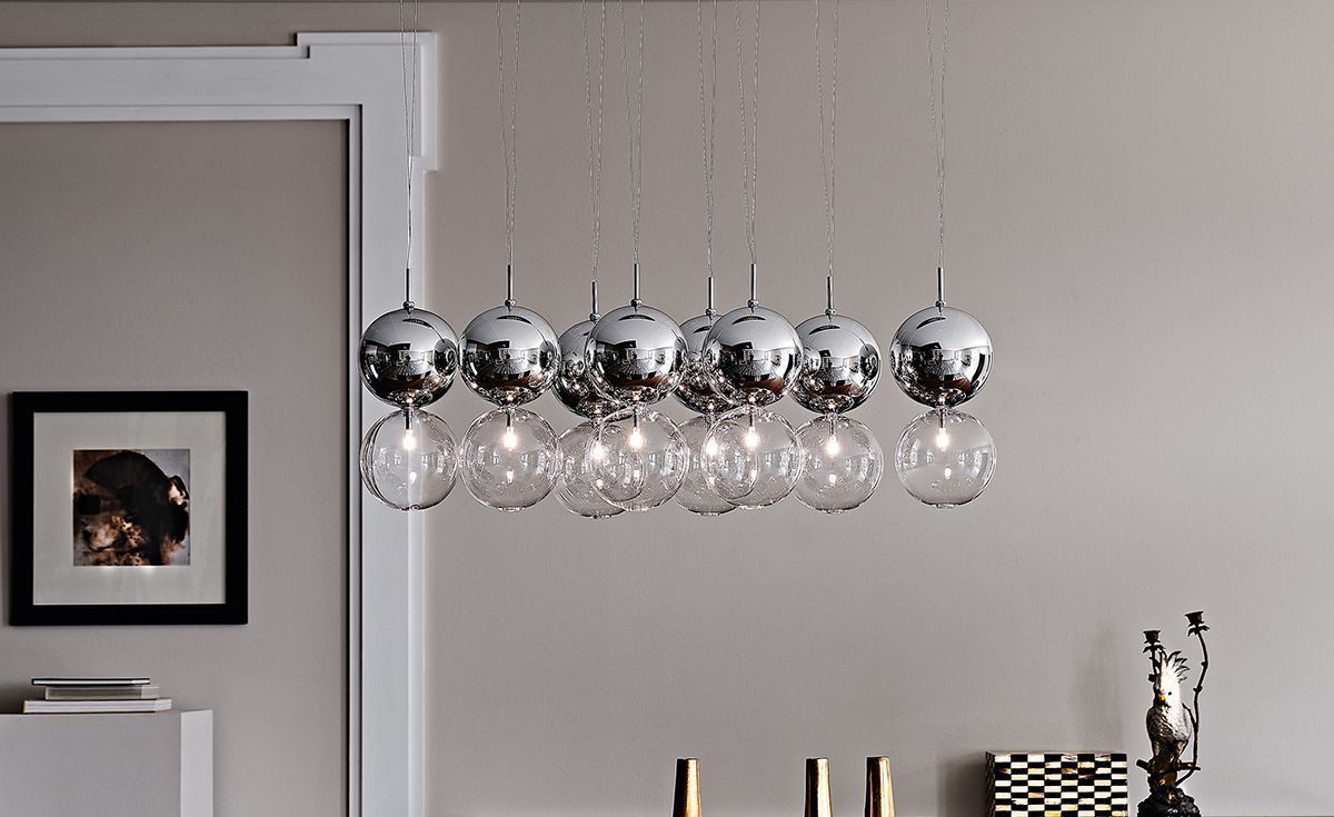 Динамическая композиция деликатных глобусов, которые, подвешенные к середине, придают атмосфере уникальность и характер. Дизайнерская люстра Apollo, созданная дизайнером Ориано Фаваретто, может иметь различные конфигурации от 2 до 16 сфер, каждая из которых способна подчеркнуть формы и объемы окружающей обстановки. Можно выбрать также цвет стеклянных абажуров, чтобы подчеркнуть оттенки комнаты. Каждая пара абажуров состоит из прозрачного нижнего и верхнего шара, окрашенного в теплые и нежные тональности.Эта элегантная современная люстра дает оригинальное освещение и делает неповторимым окружающую обстановку современного дизайна.