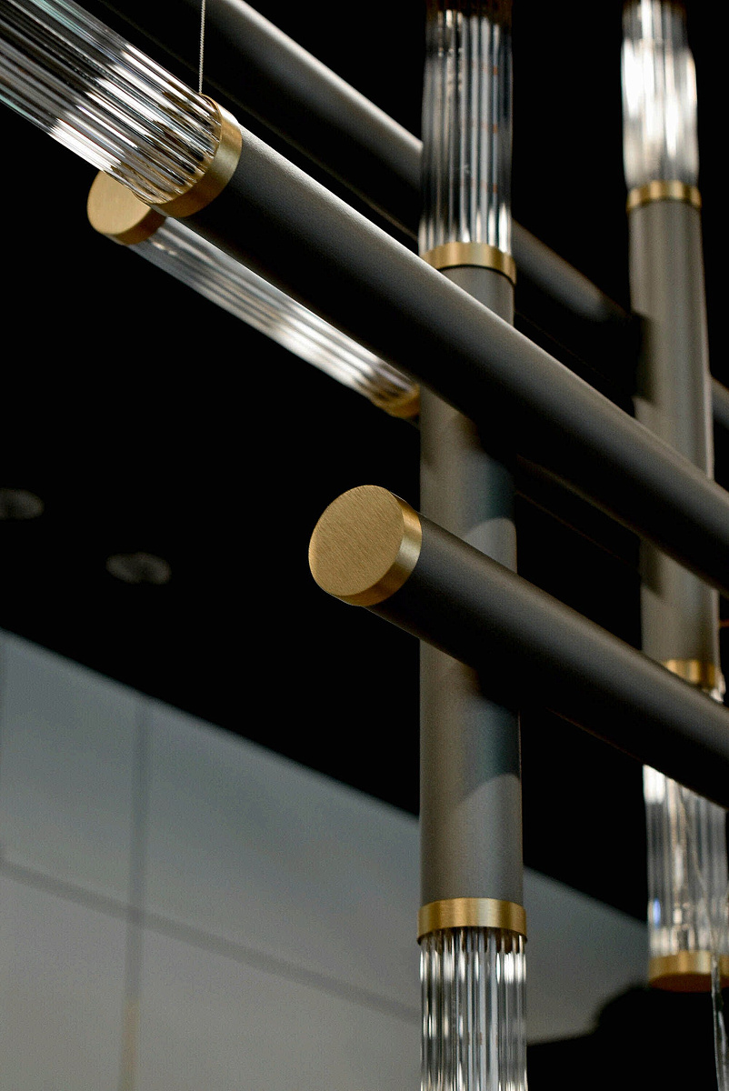 Необходимые технические компоненты необходимы для разделения различных материальных секций, которые украшены и подчеркнуты отделкой из матовой латуни, таким образом становясь декоративными элементами.