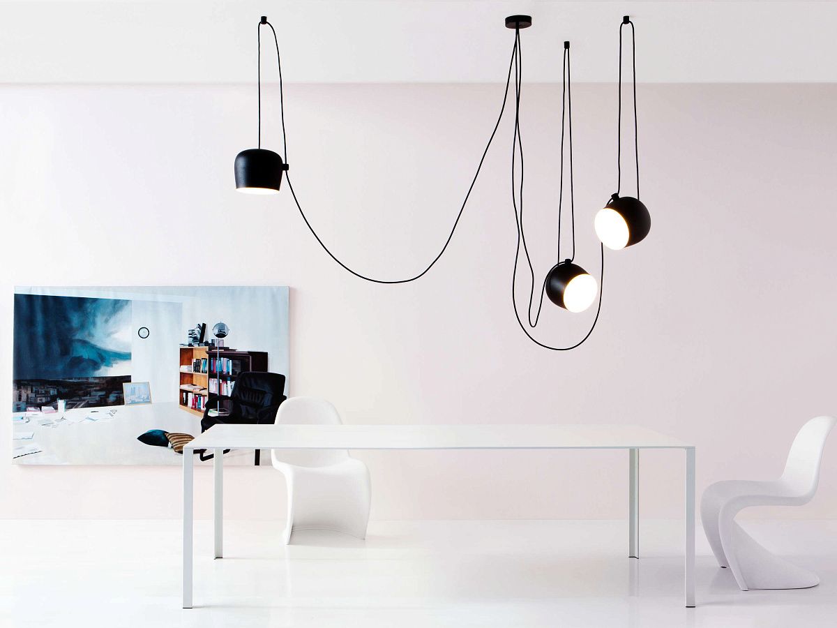 Подвесной светильник. Корпус из лакированного алюминиевого листа, плафон из фототравленного оптического поликарбоната. Внутренний отражатель из фототравленного ABS. Ориентируемое тело. Питание напрямую от сети. Светодиод можно регулировать с помощью диммера «Triac for Led», одобренного Flos. Полезная длина кабеля составляет 9 метров, поэтому лампу можно подвешивать на высоте 3 метра к потолку. Также доступна множественная розетка с возможностью подключения до 5 целей.