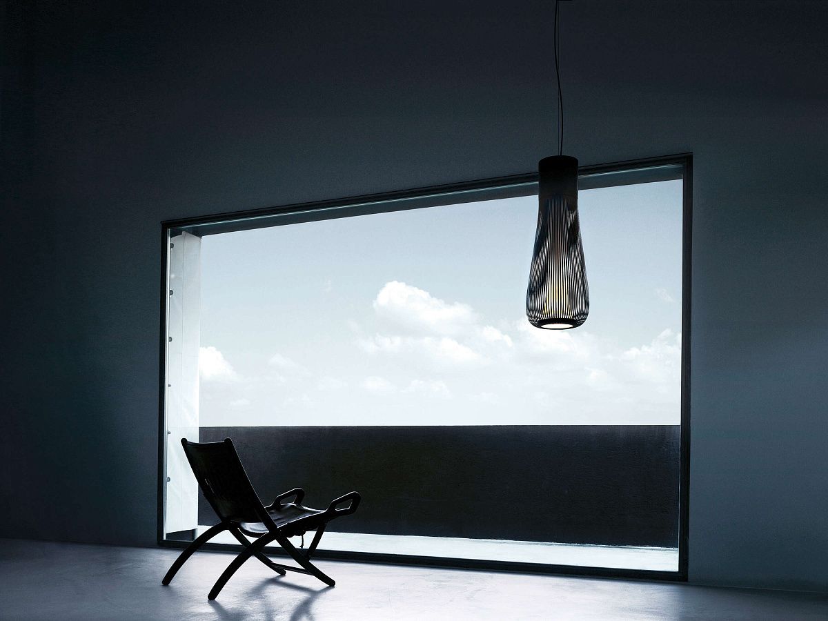 Подвесной светильник, обеспечивающий рассеянное освещение. Корпус из нержавеющей стали, подвергнутый химическому фототравлению, и диффузор из боросиликата. Защита жидкой краской. Основание из литого под давлением алюминия, потолочная розетка из полиамида, армированного на 30% стекловолокном, прикрепленная к потолочному креплению из прессованной и оцинкованной стали. В этой версии светоизлучение можно регулировать с помощью механического движения, открывающего жалюзи, тем самым изменяя форму светильника. Стальной подвесной трос, шнур питания из ФЭП/ПВХ того же цвета, что и светильник.
