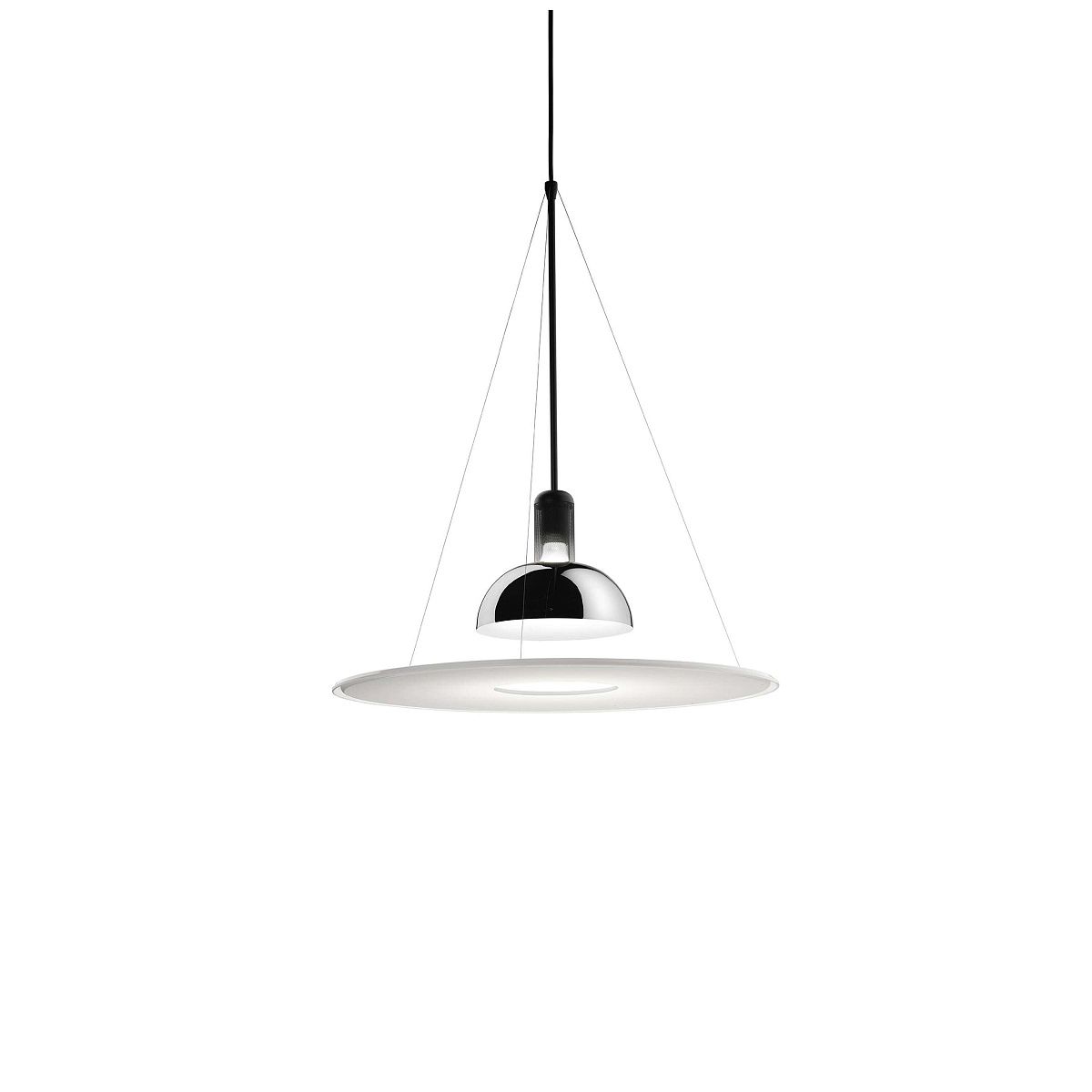 Подвесной светильник, дающий прямой, рассеянный и отраженный свет. Рассеивающая пластина из опалового полиметилметакрилата (ПММА), отлитая под давлением, подвешена на трех тонких стальных тросах. Отражатель из штампованного листового металла, полированного, никелированного и покрытого цапоновым лаком, окрашенного внутри в белый глянцевый цвет. Потолочный светильник из литого пластика ABS, окрашенный в черный цвет, и розетка.