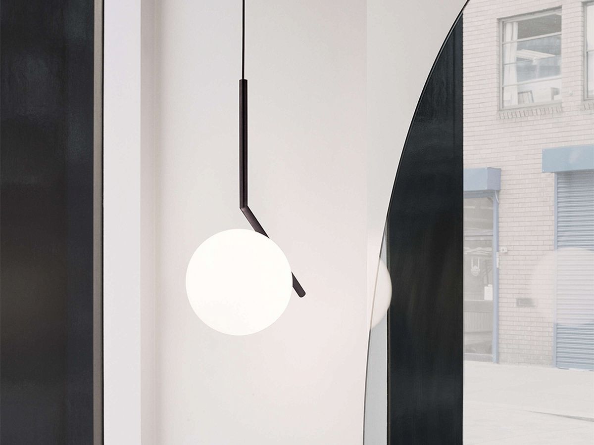 Подвесной светильник, дающий рассеянный свет. Рамка из латуни, хрома или черного цвета. Рассеиватель из дутого опалового стекла.