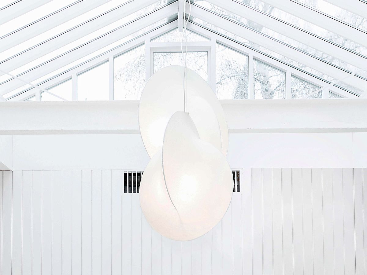 Подвесной светильник с рассеянным светом. Внутренняя конструкция из стали, окрашенной белой порошковой краской. Диффузор из смолы Cocoon, напыленный на конструкцию, с прозрачной защитой, созданной напылением в конце обработки, кольцо для замены диффузора из печатной стали с полированной, позолоченной «гальванической» отделкой. Роза, отлитая под давлением, с полированной и позолоченной гальванической отделкой Zama.