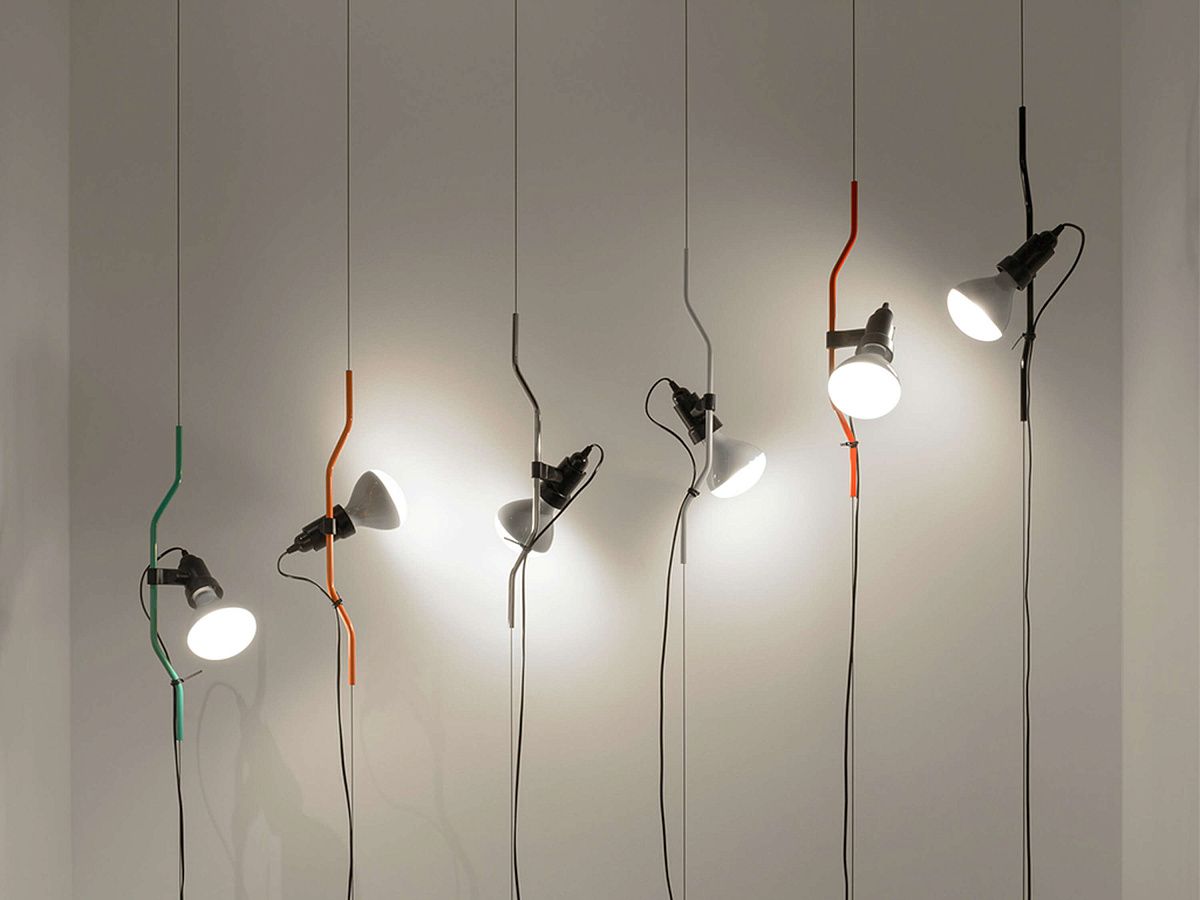 Лампа, дающая прямой свет. Лампа перемещается вертикально за счет скольжения окрашенной или никелированной профильной стальной трубы по стальному тросу от потолка до пола (длиной 4000 мм). Головка светильника изготовлена ​​из литого черного эластомера, в котором находится переключатель. Длина шнура питания от патрона 4000 мм. Вес нетто 3 кг.