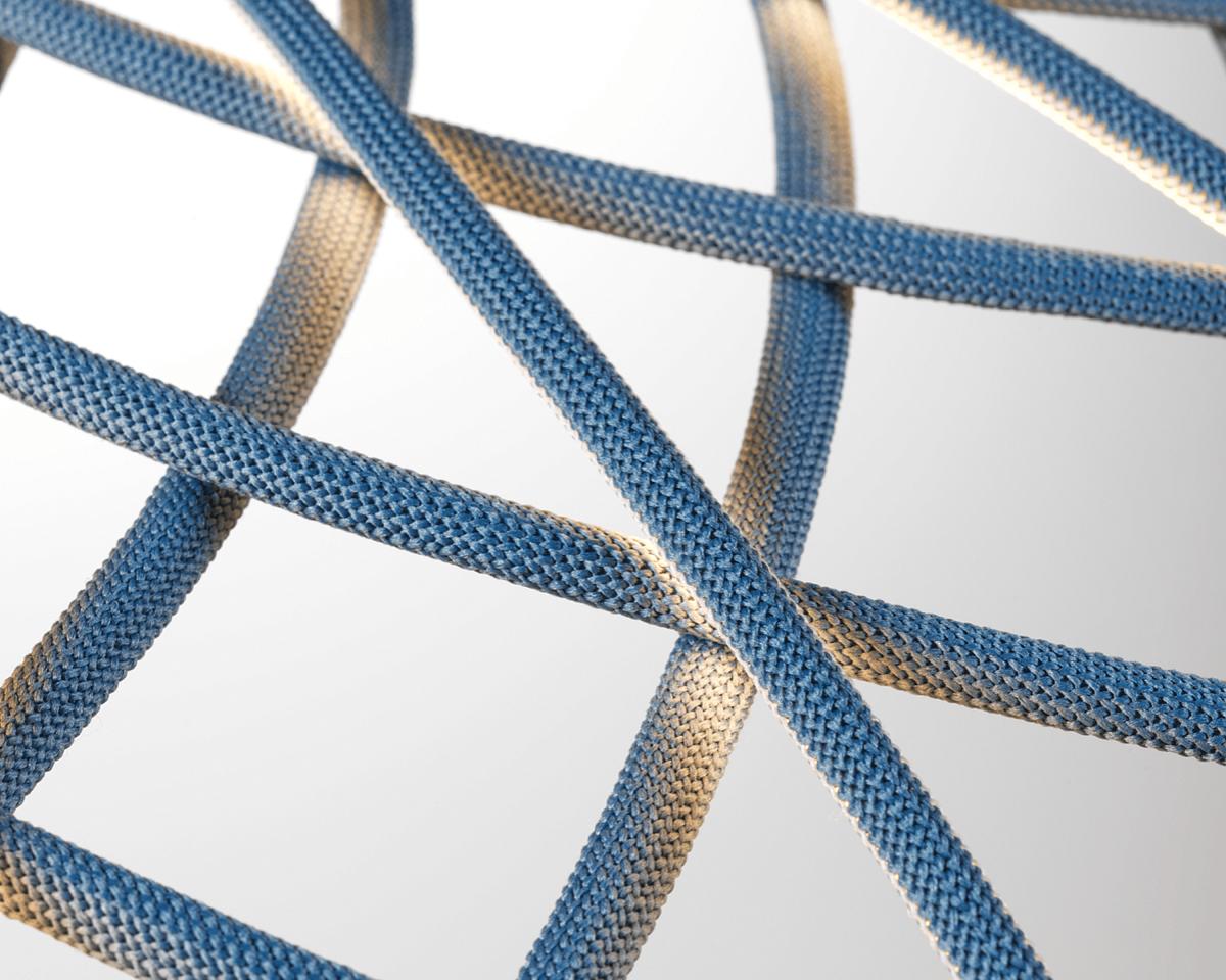 Подвесной прибор рассеянного освещения. Купол представляет собой комбинацию светящихся и темных элементов, собранных в сеть и состоящих из основных структур, покрытых тонкой переплетенной цветной трубчатой ​​сеткой, изготовленной из переработанной и пригодной для вторичной переработки ткани, изготовленной из полиэстера. Каждый отдельный световой элемент питается от специальных микроразъемов, расположенных в верхней части купола и покрыт двухцветной сеткой, а сторона, обращенная внутрь купола, всегда белая, чтобы обеспечить оптимальное излучение света от светодиодного модуля. Прибор оснащен встроенной системой балансировки в верхней части купола, которая помогает регулировать его баланс, делая его абсолютно стабильным. Нижняя часть купола дополнена алюминиевым кольцом, которое удерживает всю сетевую структуру купола на месте с помощью простой системы защелкивания. Изделие собирается абсолютно без клея, поэтому его можно полностью разобрать для переработки в будущем, а также в случае ремонта или замены. Доступные варианты отделки лампы: синий турмалин, миндаль, антрацит или кирпично-красный. Пластиковая потолочная розетка, окрашенная в ту же отделку, что и лампа, оснащена встроенной электроникой, позволяющей использовать различные системы диммирования: 0-10 В / 1-10 В / DALI / PUSH.