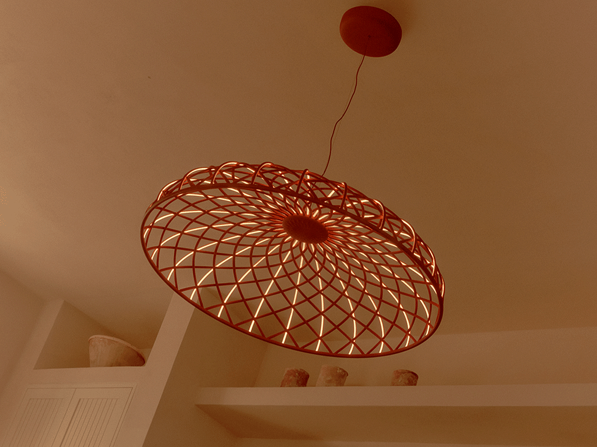 Подвесной прибор рассеянного освещения. Купол представляет собой комбинацию светящихся и темных элементов, собранных в сеть и состоящих из основных структур, покрытых тонкой переплетенной цветной трубчатой сеткой, изготовленной из переработанной и пригодной для вторичной переработки ткани, изготовленной из полиэстера. Каждый отдельный световой элемент питается от специальных микроразъемов, расположенных в верхней части купола и покрыт двухцветной сеткой, а сторона, обращенная внутрь купола, всегда белая, чтобы обеспечить оптимальное излучение света от светодиодного модуля. Прибор оснащен встроенной системой балансировки в верхней части купола, которая помогает регулировать его баланс, делая его абсолютно стабильным. Нижняя часть купола дополнена алюминиевым кольцом, которое удерживает всю сетевую структуру купола на месте с помощью простой системы защелкивания. Изделие собирается абсолютно без клея, поэтому его можно полностью разобрать для переработки в будущем, а также в случае ремонта или замены. Доступные варианты отделки лампы: синий турмалин, миндаль, антрацит или кирпично-красный. Пластиковая потолочная розетка, окрашенная в ту же отделку, что и лампа, оснащена встроенной электроникой, позволяющей использовать различные системы диммирования: 0-10 В / 1-10 В / DALI / PUSH.