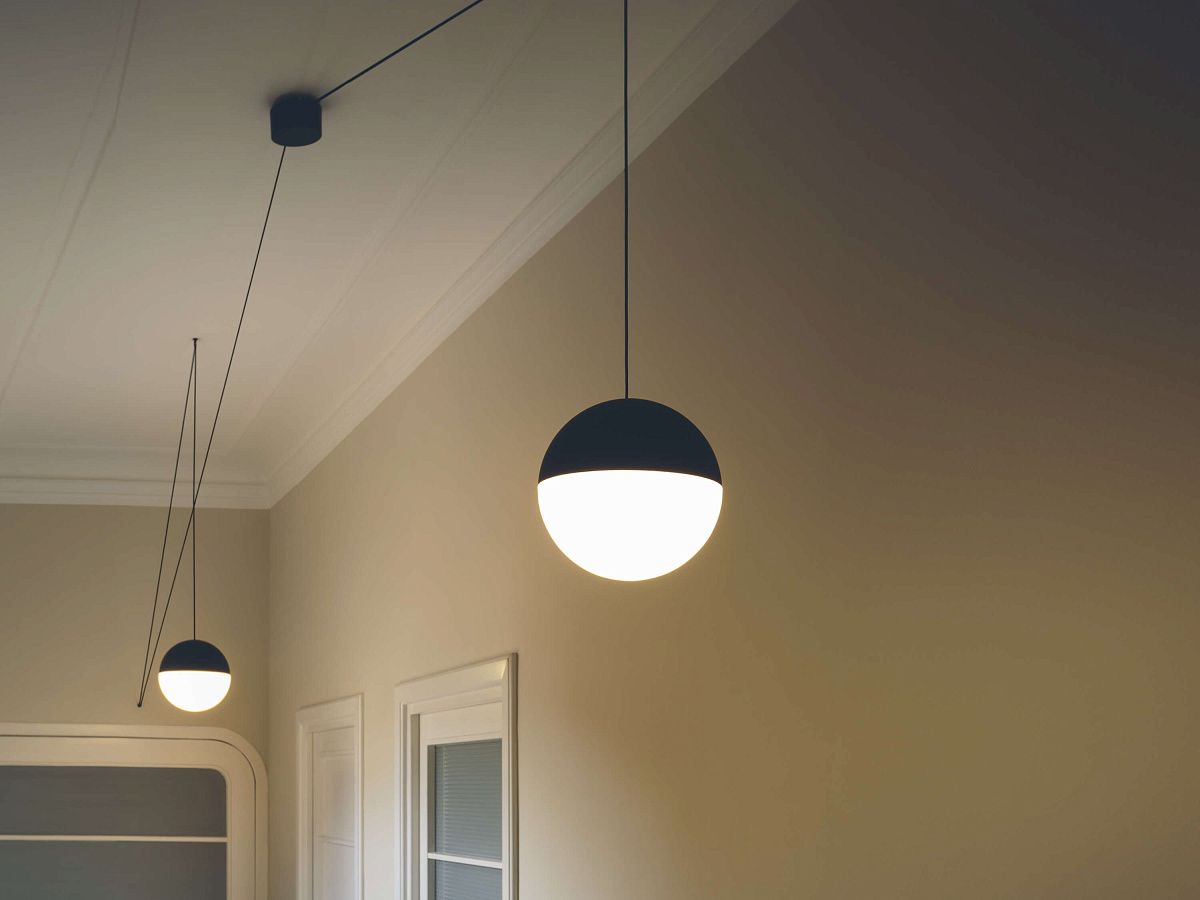 Подвесной светильник, дающий рассеянный свет. Корпус из литого под давлением алюминия черного, белого или синего цвета покрыт прозрачным мягким лаком. Оптический рассеиватель из опалового ПК. Подвесная система длиной 12 метров с коаксиальным кабелем, армированным кевларом. Доступен с настенным/потолочным подключением из черного ПК и блоком питания с напольным выключателем из черного лакированного ПК. Переключатель включения/выключения является электронным, с оптическим и сенсорным механизмом затемнения или сенсорным затемнением и версией CASAMBI Ready. Диммер в комплекте. Обязательно необходимо добавить напольный переключатель или потолочную/настенную розетку.