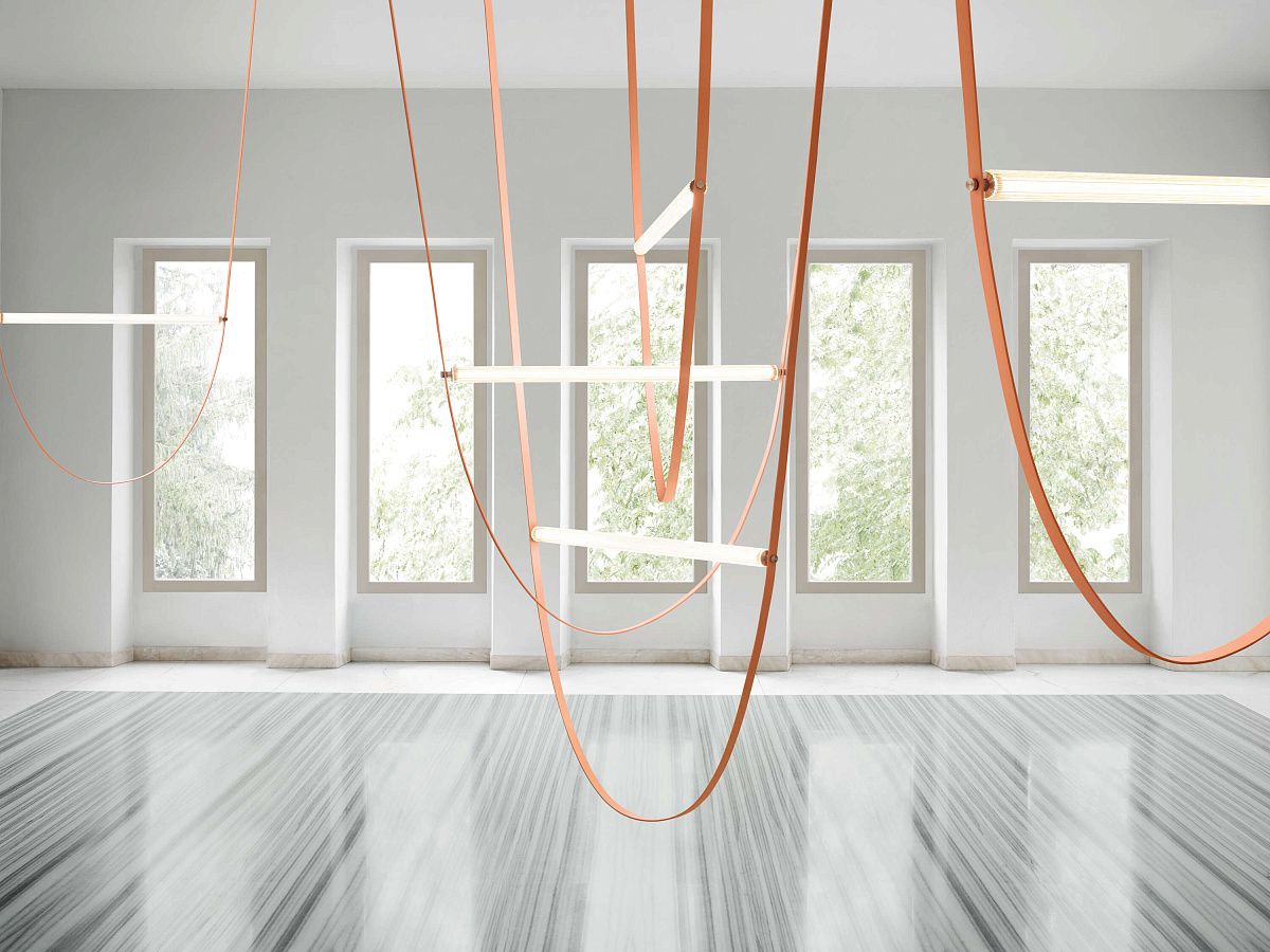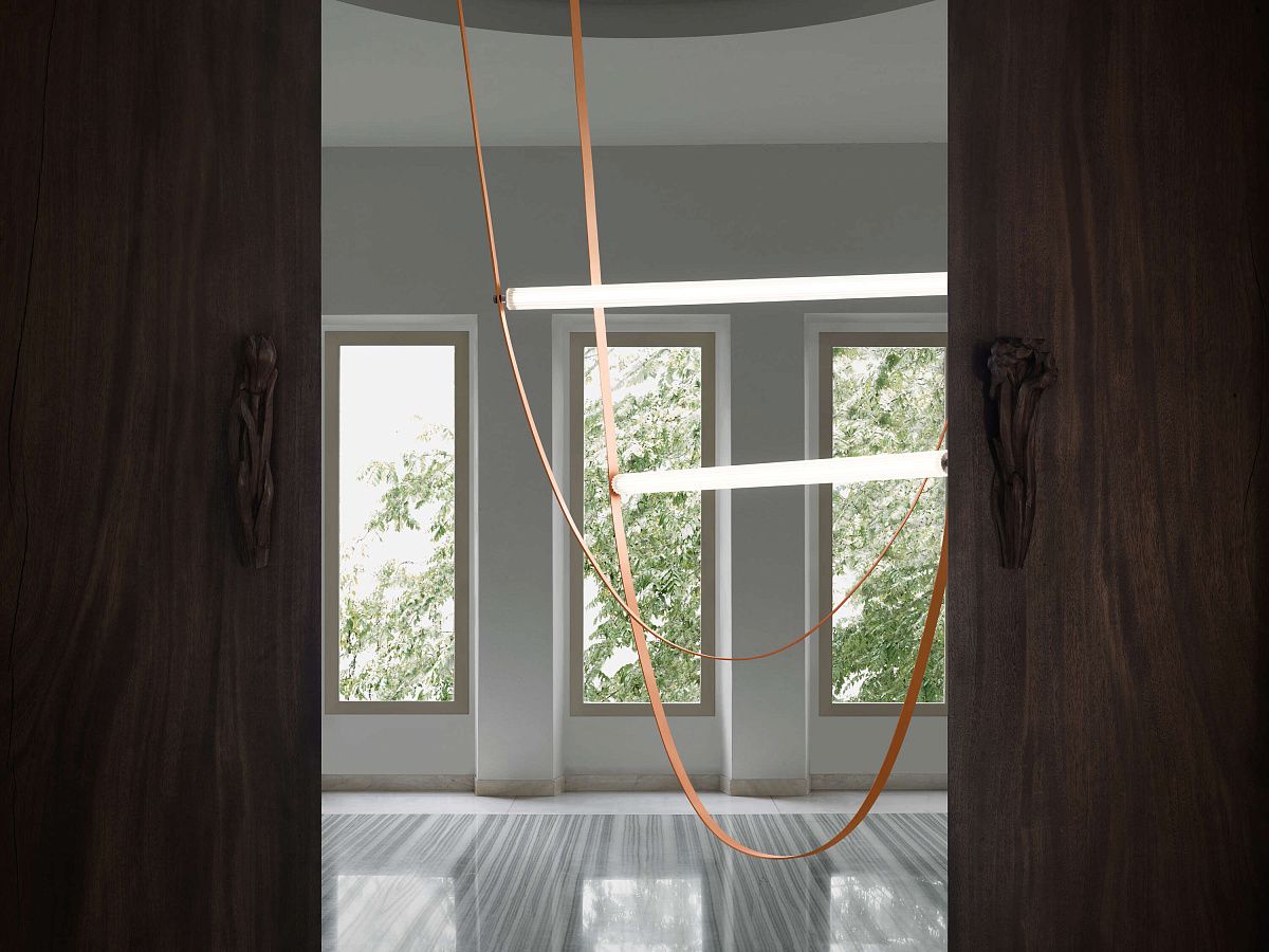 Подвесной светильник с рассеянным светом. Трубчатый светильник из прозрачного экструдированного стекла и внутренний рассеиватель из опалового ПК. Наконечники изготовлены с использованием технологии ЧПУ из сатинированной нержавеющей стали. Экструдированный кабель из резины розового и зеленого цвета. Розетка ПК, отлитая под давлением, с той же отделкой, что и кабель. Электроника, встроенная в потолочную розетку, позволяет использовать различные системы димеризации: нажимную, 1-10, потенциометрическую, DALI. При отсутствии этих систем световой поток можно регулировать при монтаже, включив в плафон нажимную систему. Полезная длина кабеля 3м.