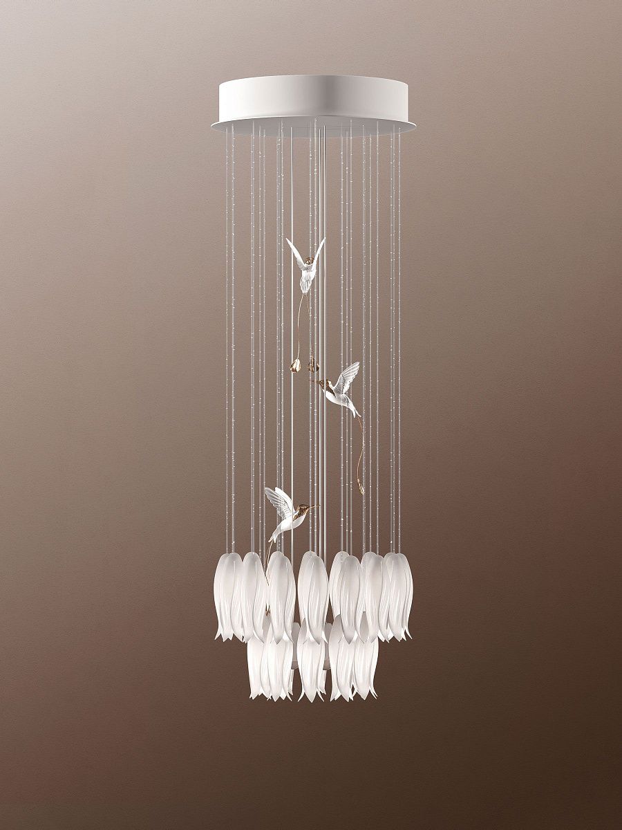 Эта люстра принесет в ваш дом особую энергетику, наполнит его светом и гармонией. Alba воплощает поэзию цветения и полёта: фарфоровые бутоны и птички колибри собраны в симметричную композицию. Подходит для классических и ар-деко интерьеров, где важны мягкость формы и тепло света.