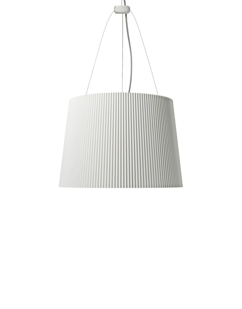 Ge — подвесной светильник, крепящийся к потолку с помощью декоративной розетки, напоминающей старинные венецианские люстры. Он оснащен плиссированным абажуром диаметром 37 см. Высота троса регулируется от 45 до 230 см.